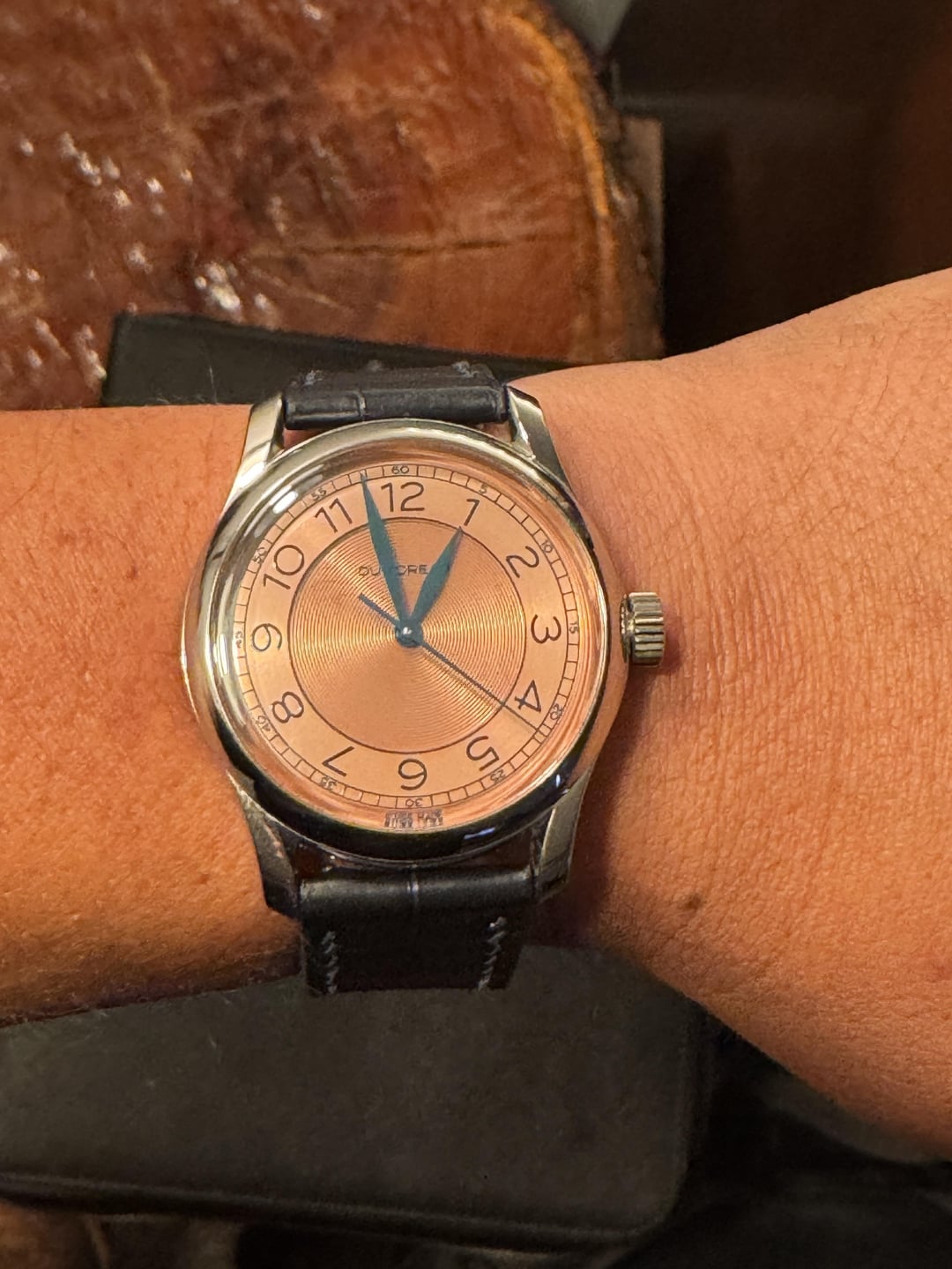 Up for sale is my DM02 in Salmon by Dumoreau. Full Set. Pictured on my 7.25” wrist. Asking: $920 shipped CONUS. Zelle/Venmo DM02 edition 276 of 300 watches across 4 dial variants. Edition of 150 in Salmon dial. Swiss-made. Polished 316L stainless steel case. Manual wound Sellita SW 210-1, 28800 vph, 42 hours power reserve. 39mm diameter, 9.5mm tall, 46mm lug to lug. 100m water-resistant. Sapphire crystal (front and back). Two-piece dial construction with concentric circles at the center and periphery and circular brushed finish at numerals. 20mm Italian leather strap (blue textured calfskin). [Timestamp](https://imgur.com/a/TOIJ2F0) [Gallery](https://imgur.com/a/TOIJ2F0) Feel free to ask questions and make offers. Van video chat if you want to see more of the watch.