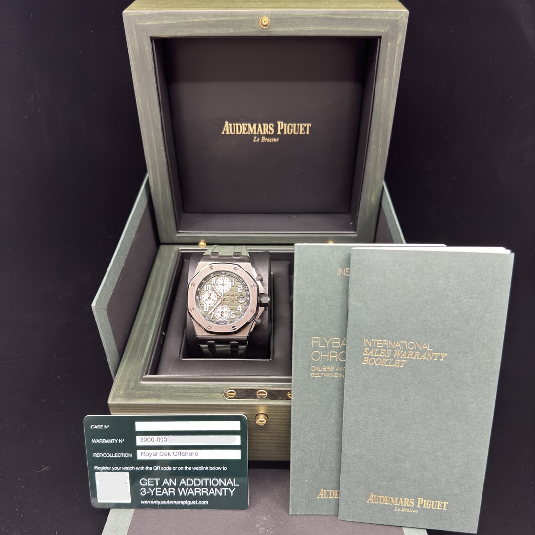 **2023 Audemars Piguet Royal Oak Offshore Chronograph Titanium Green Dial – Reference 26238TI.OO.A056CA.01** **Price: $33,000 + Shipping (Trades Welcomed)** **Timestamp:** [https://imgur.com/a/mQWUUXA](https://imgur.com/a/mQWUUXA) **Album:** [https://imgur.com/a/mQWUUXA](https://imgur.com/a/mQWUUXA) The Audemars Piguet Royal Oak Offshore Chronograph with a Titanium Green Dial featuring a 42mm lightweight titanium case and bezel, this timepiece is highlighted by its eye-catching green dial with the iconic “Méga Tapisserie” pattern, creating a bold visual appeal. Active Warranty Until June 2028 [**Complete Set Includes:** Double Box, Original Booklet, Warranty Card]() **Condition:** Excellent **Key Features:** * **Case Material:** 42mm Titanium (lightweight yet durable) * **Dial:** Stunning green dial with contrasting white subdials * **Bezel:** Brushed titanium * **Strap:** Unique khaki green rubber strap with textile decoration **Located in:** Los Angeles, CA **Shipping:** Fast, fully insured via FedEx overnight I stand behind each of my timepieces and guarantee 100% authenticity. I’m happy to hop on a call or FaceTime to show you the watch and answer any questions. Don’t hesitate to reach out!