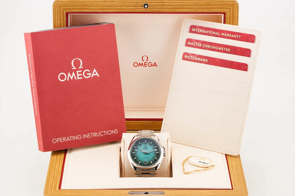 Up for sale is a brand new Omega Aqua Terra 8900 41mm Turquoise Dial on Bracelet, reference # 220.10.41.21.03.006. It comes complete with all boxes, papers, booklets, hang tag and Omega Warranty Card dated June 2025.