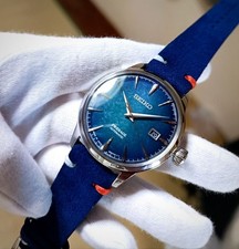 This is the japanese JDM version of the Seiko Presage Star Bar Starlight, the western version being the SRPC01. Limited edition of 1300 units total. Beautiful blue, mottled dial with a classic case and crown shape. Expedition caseback shows off the movement with the gilded rotor. Overall condition is very good/like new, with the protective plastic film still in place over the caseback. Full set, with outer and inner boxes, hangtags and miscellanea. 40.5mm in diameter, 20mm lug width. My asking price is 825$ shipped, but I am open to offers.