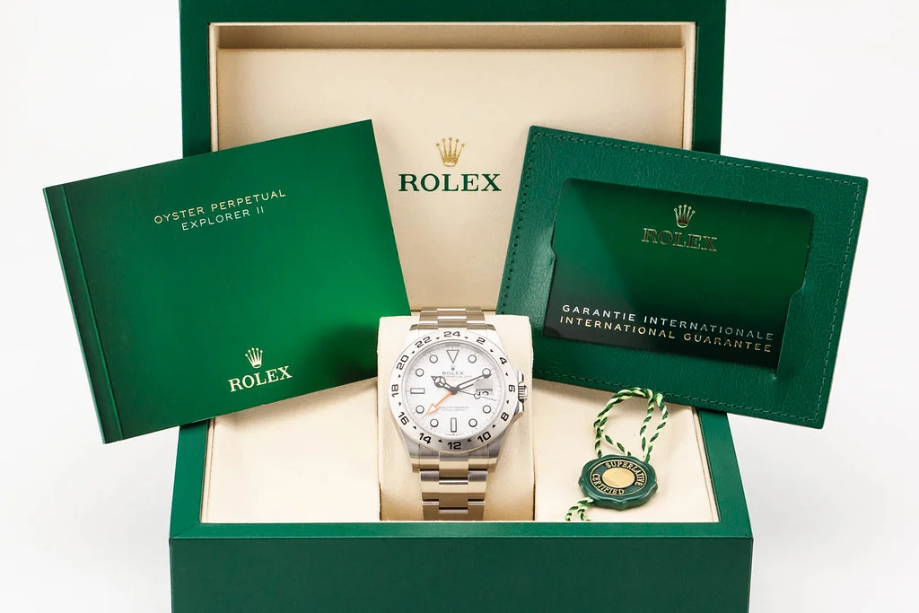 Up for sale is a brand new Rolex Explorer II 42mm Polar White Dial, reference # 226570. It comes complete with all newly redesigned boxes, papers, booklets, hang tag, and Rolex Warranty Card dated February 2025.
