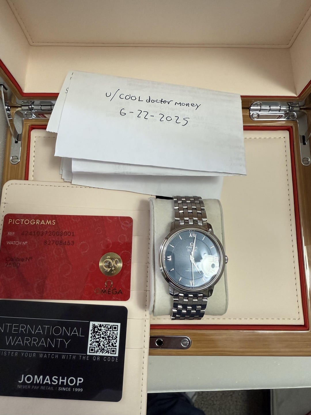 Hello. This is my Omega De Ville Prestige (full set) that I picked up from Jomashop in June 2023. Runs flawlessly. It’s in really great shape! Some noticeable wear on the clasp and the back of the case, but pretty minor. I’m looking for $1,750 OBRO plus $70 insured shipping in the US. I understand that I have no transactions on here, however, I’ve bought and sold a few watches on watchuseek and Chrono24. I’m very happy to text/video call about this piece. You’ll be very happy adding this to your collection. It’s gorgeous!