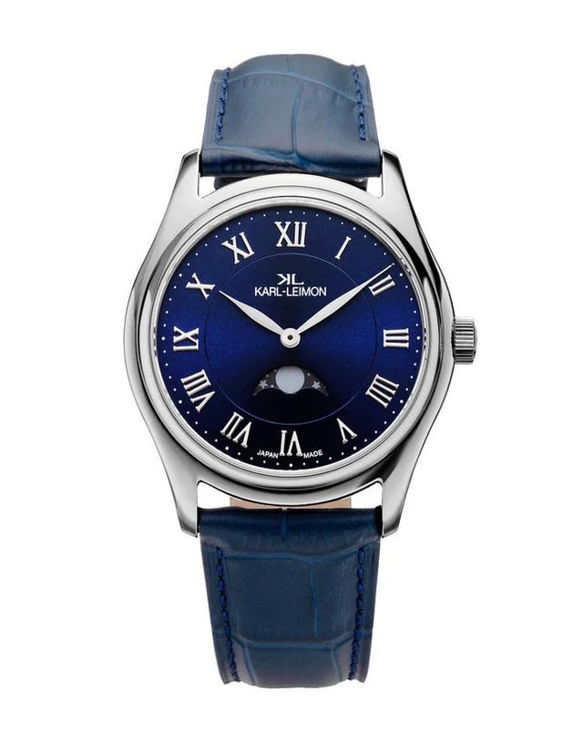 **New in box Karl Leimon quartz moon phase. This is a small Japanese microbrand that produces some very nice watches. This one is 38mm, Swiss quartz moon phase movement, sapphire and applied indices. Nice blue strap with deployant clasp.** **Bought this on a whim (I am a sucker for moon phase complications) but it is too close in color and size to others in my collection so off it goes.** ***NOW $199.00*** ***~~$220.00~~*** **with all boxes, papers, etc. and in pristine** **condition.** **I have lots of positive feedback here. Been in the watch hobby for several years; selling some watches since I have simply accumulated too many.** **Any questions please reach out through messaging or by email tda1900 AT Gmail.** **I am a casual collector bitten by the Watch Bug several years back; not in it to make any money, just support an ever changing collection.** **I provide shipping and insurance to USA only. I'm located in SE Kansas.** **THANKS for Looking!**