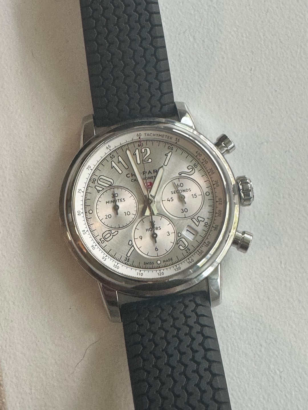 Up for sale is a Chopard Mille Miglia Chronograph 42mm (2024) **Size:** 42mm **Thickness:** 12.67 mm **Reference:** 168589-3001 **Power reserve:** Approx. 42 hrs **Water resistance:** 50M **Condition:** Watch is in excellent condition. Purchased new in 2024 from Watches of Switzerland (1 owner). Clean case with minimal scratches. Warranty still active. Comes with box, papers, original rubber strap . **Pictures / Timestamp:** above **Price:** **~~$4200~~** **---> $3500 including shipping fully insured in Continental US.** Payment methods accepted are Zelle and Bank Wire. No PayPal (no exceptions). **Trades:** Unlikely but feel free to send over with model, timestamp, and trade value. Will not engage in trade offers without all of the aforementioned items.