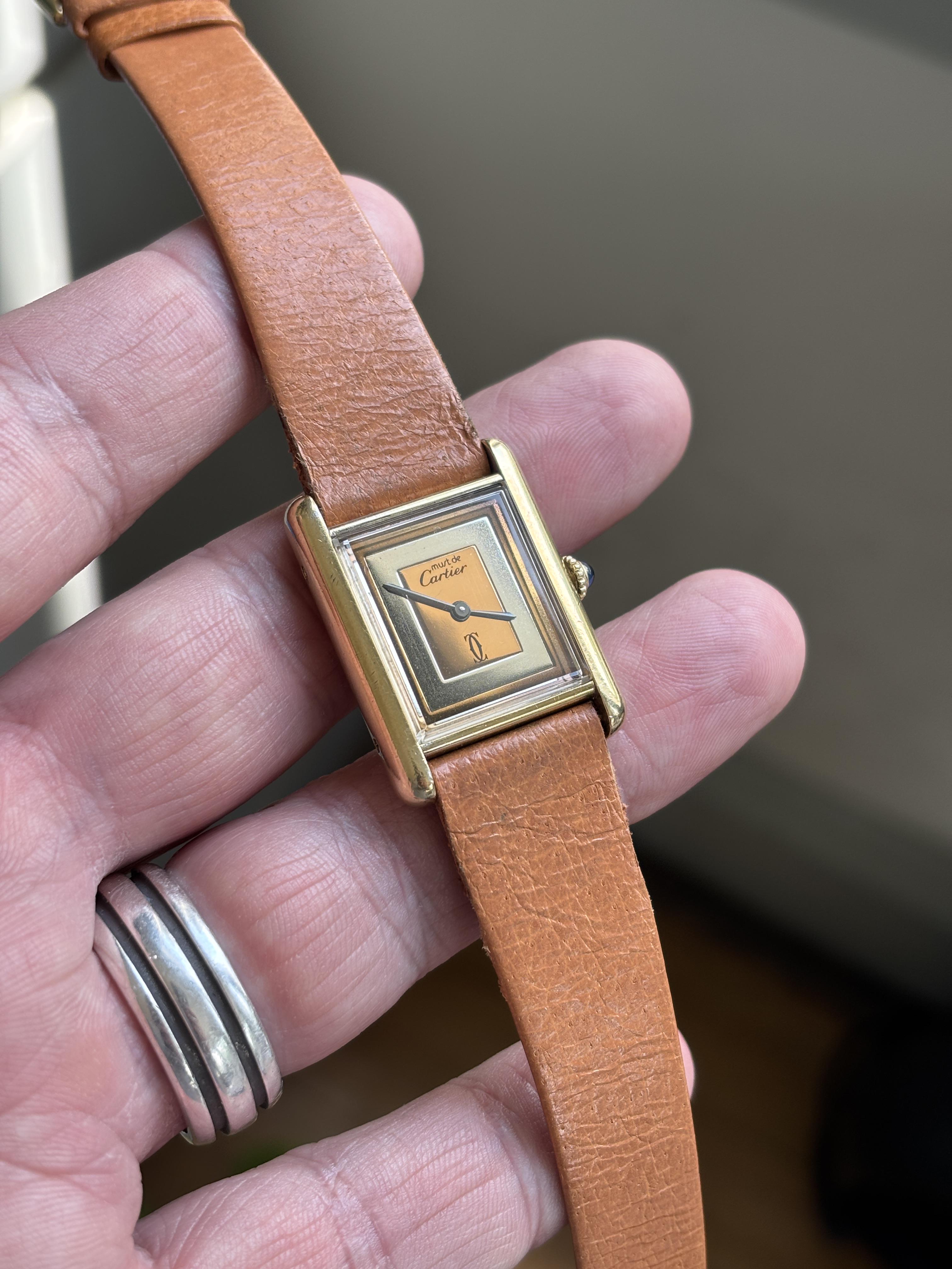 Hello everyone! Up for grabs is this classic Must de Cartier tank featuring the sought after "Trinity" dial (yellow, white & rose gold). The vermeil case shows very little wear and the reflective dial just pops off the wrist! The dial shows some patina, mostly in the outer ring. It's relatively even and looks quite nice, giving this example a one of a kind look. It looks even better in person as the photos accentuate any imperfections. The crystal and strap have been replaced but everything else is original. Don't get me wrong, this watch has been worn and loved, but the photos don't do it justice. [Photos](https://imgur.com/a/kV5YLMM) [Timestamp](https://i.imgur.com/sTcV20m.jpeg) * Case: 23mm, Vermeil over Solid Silver * Dial: Original * Crown: Original * Movement: Manual Cartier **I’m asking $1399 for this watch.** If interested, please consider following [Crooked River Vintage](http://www.instagram.com/crookedrivervintage) on Instagram for other vintage watch offerings. I will respond more quickly to inquiries via Instagram, Reddit can be difficult for me to check during the day. Please don't hesitate to DM me with specific questions or pic requests! **I will consider offers.** Asking price includes shipping CONUS via USPS Priority Mail. Alternative carriers and International shipping can be negotiated. I prefer Zelle or PayPal F&F for payment (add 4% if Goods and Services with good feedback). As will all vintage watches, exposure to water is not recommended and total accuracy and duration cannot be guaranteed. Unless otherwise noted service history is unknown. [Please check my profile for my other offerings!](https://www.reddit.com/user/farkasvirag/submitted/) Thanks and take care everyone!
