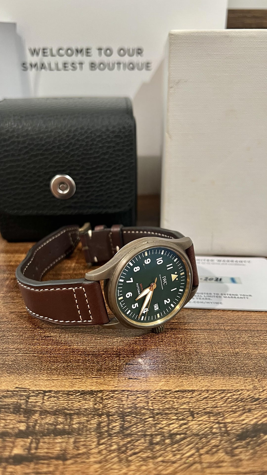 IWC Pilot’s Watch Spitfire Automatic YEAR: 2021 REF: IW326802 MOVEMENT: 32110 automatic, the first IWC watch to include this movement, 28800 VPH, 4HZ FEATURES: Hacking seconds, quickset date, screw-in crown, soft-iron inner case to protect against magnetic fields, AR coating on both sides, and a sapphire crystal secured to protect from sudden changes in air pressure. CASE: Bronze, 39mm x 49.5mm x 10.6mm, nice patina throughout DIAL: Classic Flieger layout, gorgeous green dial, red SPITFIRE insignia POWER RESERVE: 3 Days WATER RESISTANCE: 6 BAR STRAP: The leather strap was purchased in June 2025 directly from IWC and contains VERY light wear. DEFECT: Small scratch on the bead blasted stainless caseback, as shown in photos. Additional photos of condition in Imgur link. Buyer due diligence required prior to purchase. IMGUR: https://imgur.com/a/4Vob65G ASKING: $3500 OBO CONUS ONLY ZELLE ONLY, due diligence from buyer required prior to purchase, am willing to send videos or do a FaceTime for serious inquiries IF FULL ASKING: Full value insurance, minimum 2DA shipment speed, possibly NDA shipping speed depending on destination