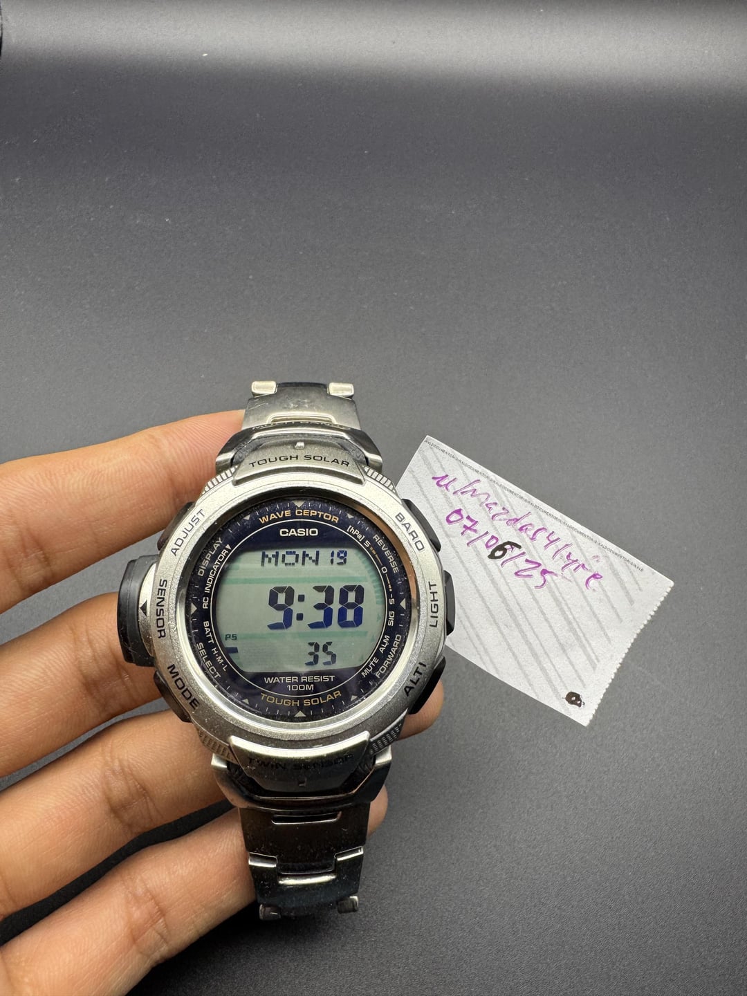Selling rare Casio solar powered watch with many features. Watch appears to function well although not every single function has been tested. The watch has very little wear from typical use but overall is in great shape. The length and size as shown in photos. Asking $75 shipped with in USA. Pay with Venmo or PayPal F/F or Zelle First photo updated Timestamp