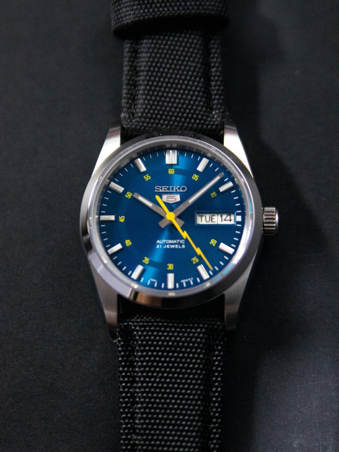 hey everyone, i have a beautiful seiko mod up for sale today. i based it all on the super cool dial from an OEM SNKN21 Seiko. It has those yellow accents so i wanted to find a yellow hand that would fit well. Originally i had a more “plain” seconds hand in mind, but this lightning bolt seconds hand looks so much cooler in my opinion. also using a fully-lumed day/date wheel, so it looks great in the dark too. the explorer-style case is 36mm across, 44.2mm lug to lug, 20mm lug width, and 12.4mm thick with a sapphire crystal and screwdown case back and crown. it’s running on a regulated seiko NH36. Asking $239 shipped CONUS for this beautiful piece. i take paypal and just add 3.5% to the total if you use the goods and services option. i have a long history on reddit and long history modding— let me know any questions you have! thanks guys