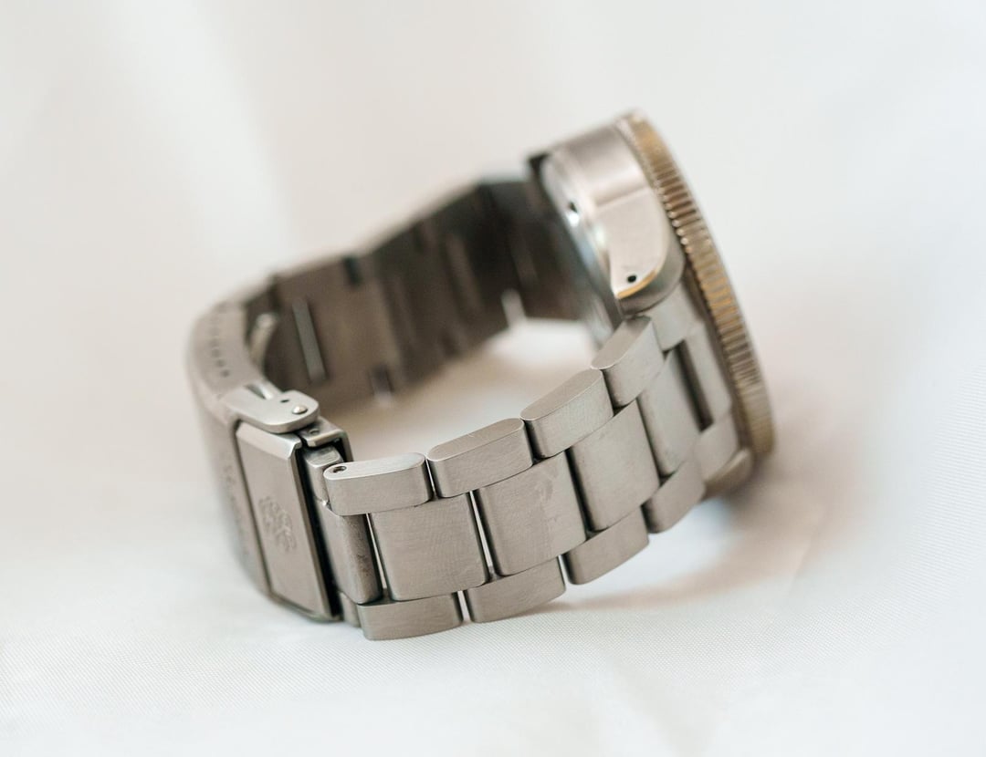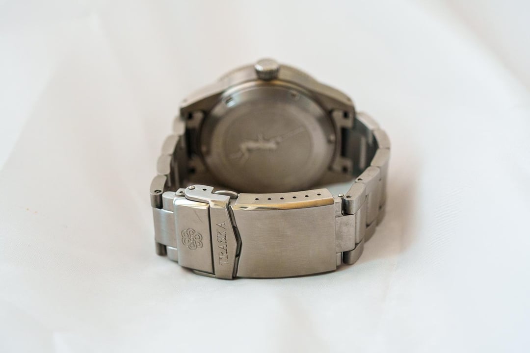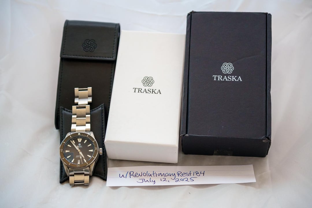 This Traska Freediver is so much bang for the buck. I’m just not wearing it. This is the second version, with a rectangular date window at six o’clock. I much prefer the rectangular date window over Traska’s current circular porthole, which is why I went on the hunt to buy this one a while back. I just got this watch back from service and it appears to be keeping good time. Traska’s proprietary hardness coating has done a good job keeping this watch looking good, but there are desk diving marks on the clasp. The pics just show my fingerprints. The bracelet doesn’t have much taper. Bezel action is fantastic! I love how readable this watch is at a glance. Includes the original box and leather travel pouch. The raw inside of the pouch is shedding a bit. The bracelet is currently sized for my 7 inch wrist and has two spare links. Asking **$400 OBO shipped** using either USPS or UPS, whatever’s most affordable. Zelle or Venmo preferred unless you'd like to cover PayPal G&S.