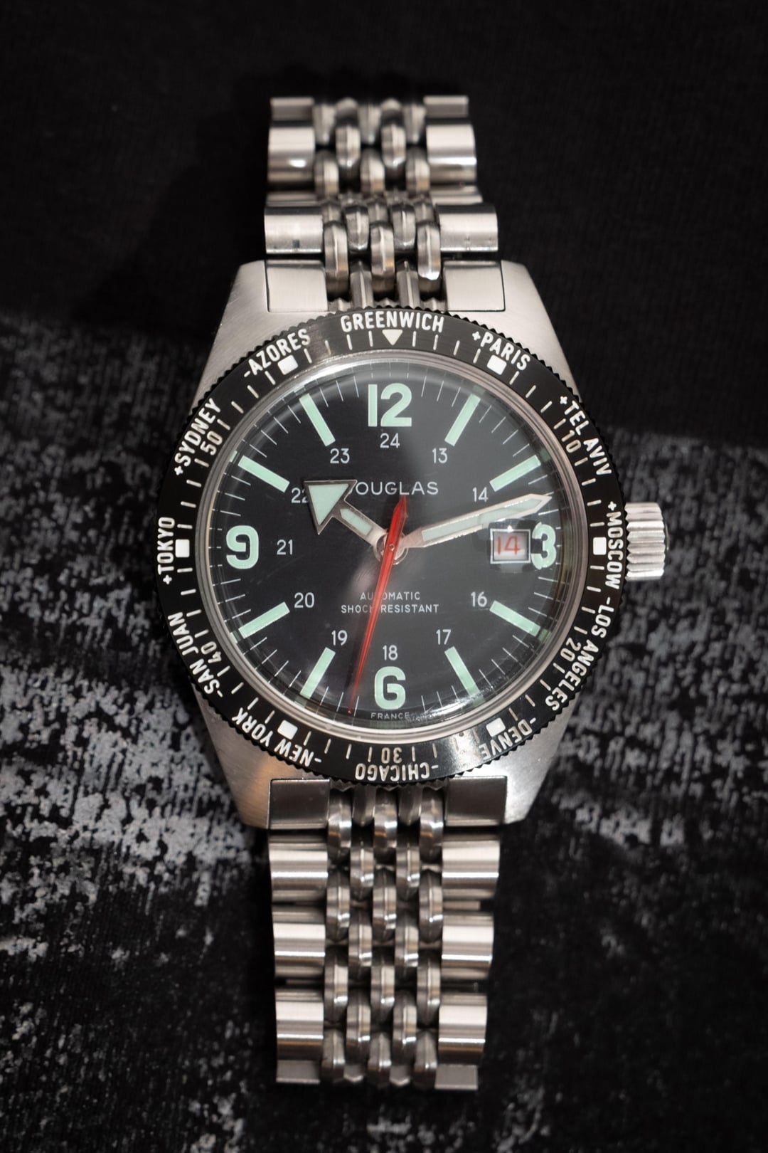 Up for sale is one of my coolest macho timepieces--bought right here on watchexchange--my Wolbrook Douglass Skindiver WT Professional X15 limited edition "Worldtimer" tool watch. Paying tribute to the similar reference from Douglas that Neil Armstrong had on his wrist during his historic missions test-piloting the X15 experimental hypersonic rocket plane in the 1960s, this special edition features a nifty engraved case back, retro hesalite glass, and black PVD ratcheting worldtimer bezel. She's water resistant to 120 m and is powered by an automatic Miyota 8315 with quickset date and cyclops. 60 hour power reserve, hacking and hand-winding. Assembled in France. 40 mm diameter x 13mm to the top of the crystal. Limited to 1962 pieces. Features Wolbrook's proprietary "Hexaplex" shock resistance system. Unlike the current versions still for sale, this one includes the jubilee style bracelet with quick release, red and black bonus straps, travel case, and sew on patch. Full kit with spare bracelet links and everything. The hesalite, case sides, and clasp show some hairline scratches visible under harsh light but not noticeable on my wrist. I'd conservatively put the condition at 8/10. Priced accordingly. Asking $399 shipped CONUS. Please comment here before sending a chat. Thanks!