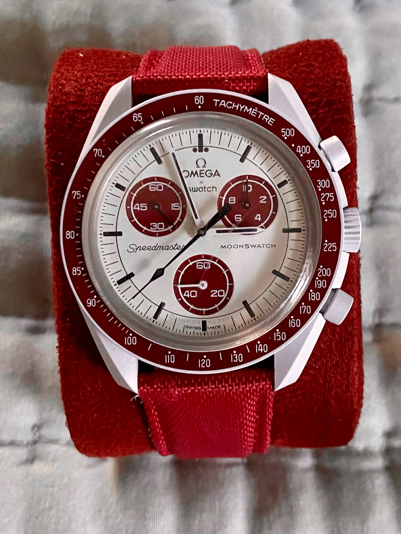 I purchased this Mission to Pluto MoonSwatch used last year and wore it a few times. It was originally purchased in November, 2022. I put a new battery in a few months back, so it should be good to go for a while. As you can see from the photos, it's on a nylon type strap and the back of the strap is leather. It comes with the original gray strap. I'm only looking to cover the cost of shipping. I'd like to see this go to someone who will wear it, or maybe know of someone who would like to have it. As you can see from one of the photos, the crystal was quite scratched, but I used up quite a bit of polywatch and it's pretty clear now.