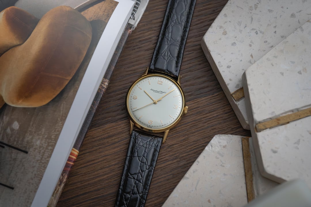 This vintage International Watch Company (IWC) dress watch is a timeless example of understated elegance and fine Swiss craftsmanship. Crafted from solid 18k yellow gold, the 35mm case strikes the perfect balance for a dress watch—neither too large nor too small, making it an ideal companion for formal occasions or everyday sophistication. Paired with a classic black leather band and an eggshell white dial in attractive condition, this watch exudes a refined and versatile aesthetic that never goes out of style. At the heart of this timepiece is the renowned IWC calibre 61 manual winding movement, a pivotal innovation in the brand’s history. Known for its precision and reliability, the calibre 61 represents IWC’s commitment to horological excellence during the mid-20th century. Its manual winding mechanism not only connects the wearer to the art of traditional watchmaking but also ensures a level of craftsmanship that collectors and enthusiasts deeply admire. This IWC dress watch is more than just a timepiece—it’s a statement of timeless style and a celebration of IWC’s legacy in fine watchmaking. Whether you’re a seasoned collector or someone seeking a classic addition to your wardrobe, this watch is a true treasure that embodies elegance and history. **The Details:** **Case:** 35mm solid 18 karat solid yellow gold case in attractive condition. It shows honest signs of wear with no major distractions. **Bezel:** 18 karat gold fluted bezel which in attractive vintage condition **Dial/Hands:** Original IWC eggshell white dial in attractive condition. The dial is strong and vibrant dial with a lot of life in hand - far nicer than the photos! The dial has never been refinished .Hands are original and attractive **Caseback:** Nice original 18 karat yellow gold back in attractive condition **Movement:** IWC calibre 61 movement running well, serviced recommend for accurate time keeping **Bracelet/Strap:** Black leather in attractive condition **Crystal:** Original acrylic in with a few light marks as expected for a vintage timepiece Available for sale US$1825
