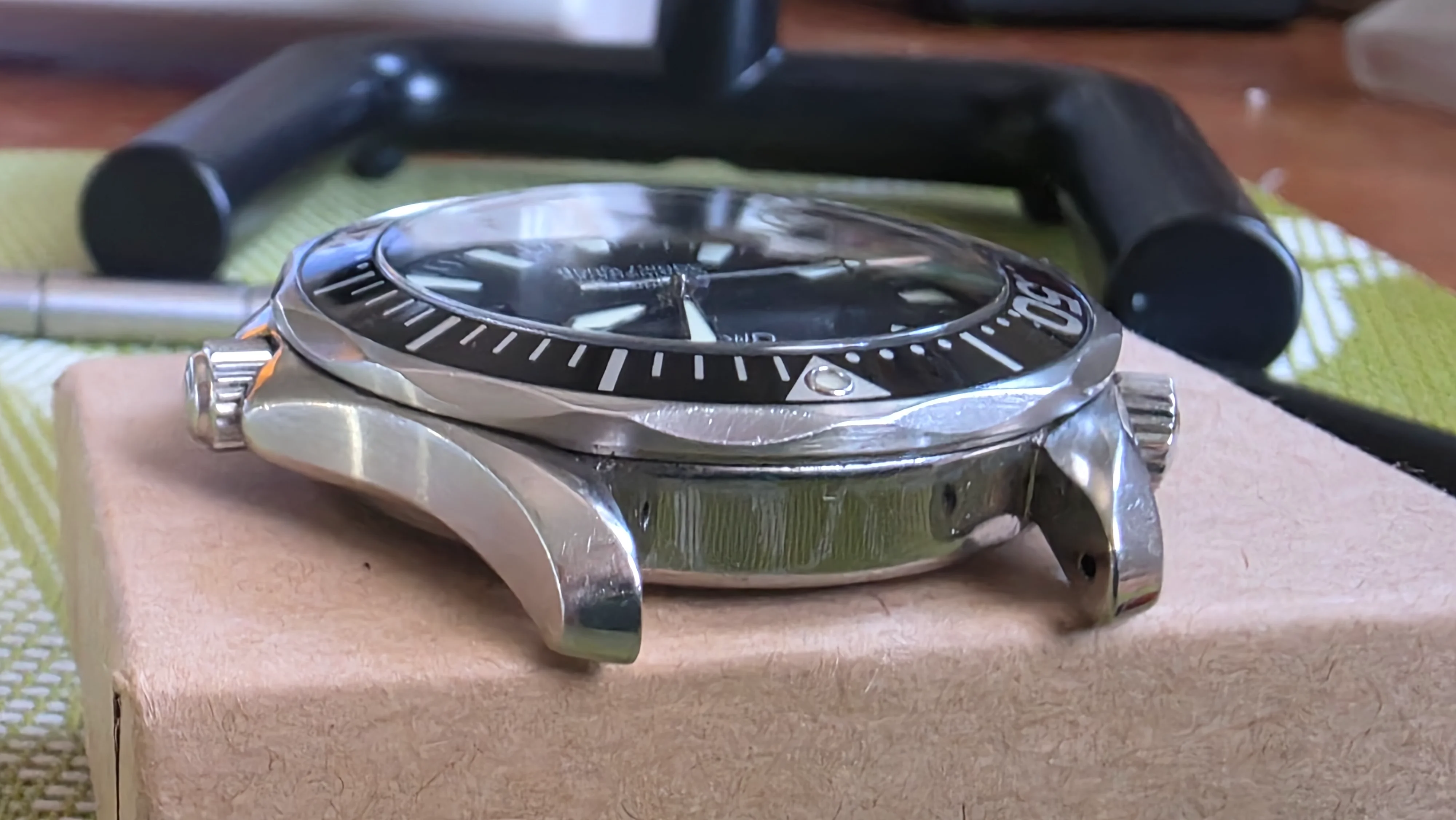 This is a regularly worn watch (in rotation), so it shows expected signs of use. As careful as I am, there are still some wear marks along the case, and outer bezel, and light marks on the bezel insert — please refer to the photos for close-ups. The crystal is in good shape with a wee mark, only noticeable with my loupe by the 25 mark (I didn't see it before, only noticed at an angle in my loupe just now and wanted to mention it). (there is dust in the photos on the crystal) The watch still presents beautifully on the wrist, though of course macro photos will exaggerate imperfections. Please ask if you would like more photos of certain angles that I may have missed. A light polish would really make this one shine!