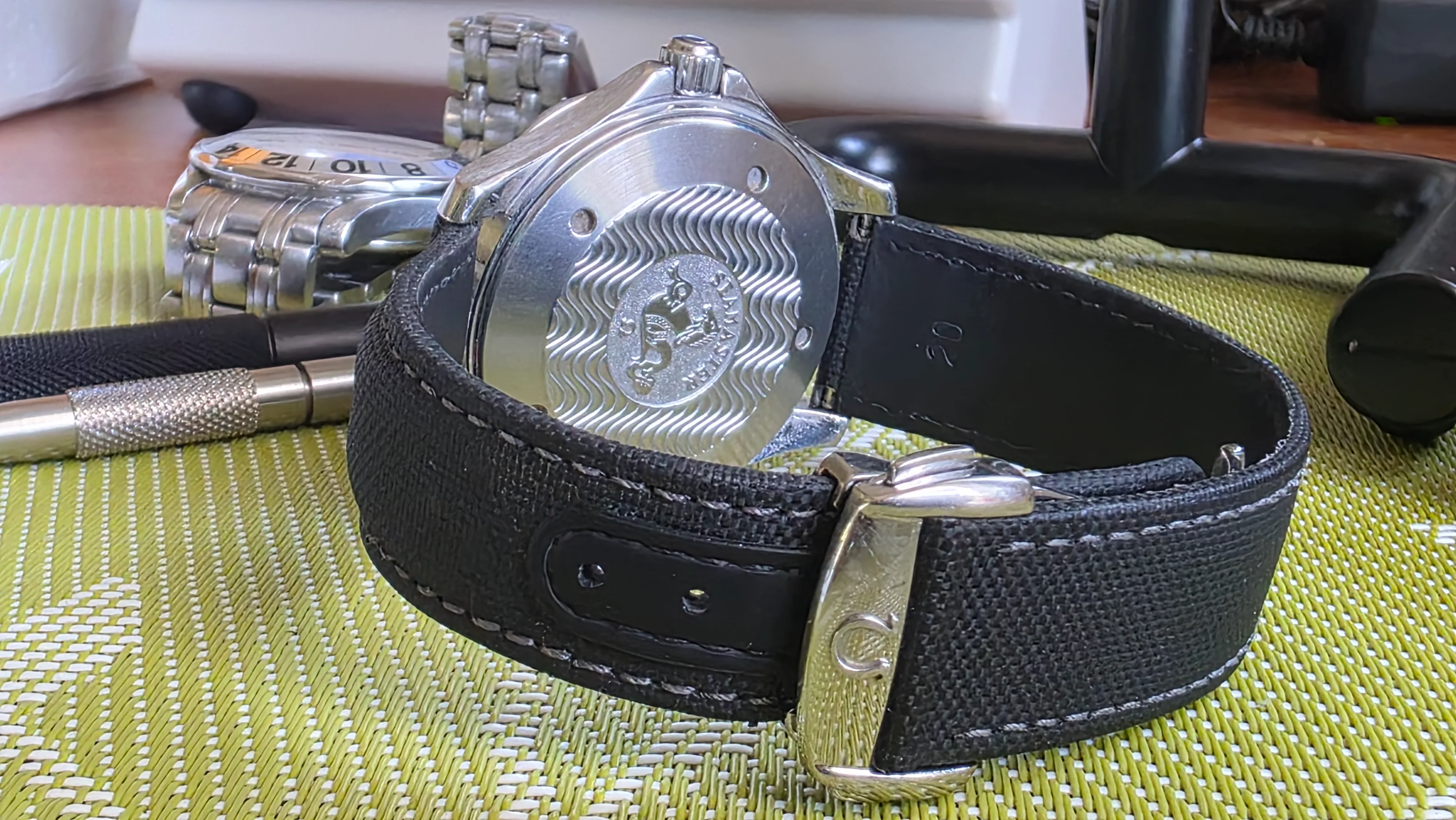 - Artem sailcloth strap (shows clasp marks underneath where the clasp sits, not visible while wearing) secured with proper OEM omega Spring bars.
