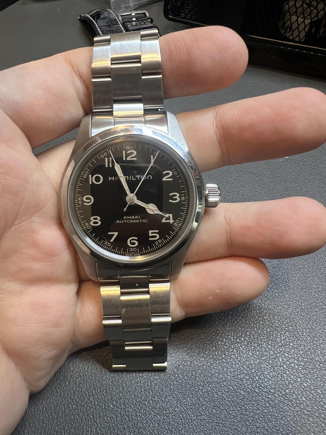 For sale is my Hamilton Khaki Field “Murph” 42mm (Ref: H70605731), a beautifully finished and cinematic field watch made famous by Interstellar. I’m only letting it go to help fund another purchase. ✅ What’s included: - Hamilton Murph 42mm watch head - OEM Hamilton leather strap (lightly worn) - Uncle Seiko “Senator” bracelet (installed — excellent match) - Crown & Buckle NATO strap (barely used) - Original box and papers - Warranty card and manuals 📌 Condition: - Excellent condition overall - Hairlines from careful wear - Crystal is clean, keeps accurate time 💵 Price: $650 shipped (U.S. only) 📦 Shipping: USPS Priority with tracking and insurance 🔒 Payment: PayPal G&S — no F&F 📍 U.S. Seller 📸 Timestamp: See image DM with questions or offers. Thanks for looking!