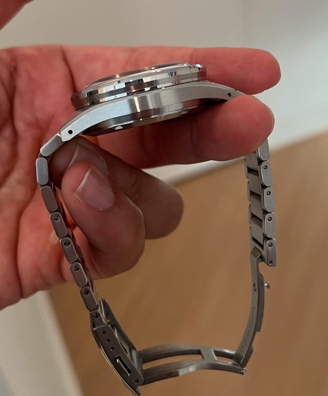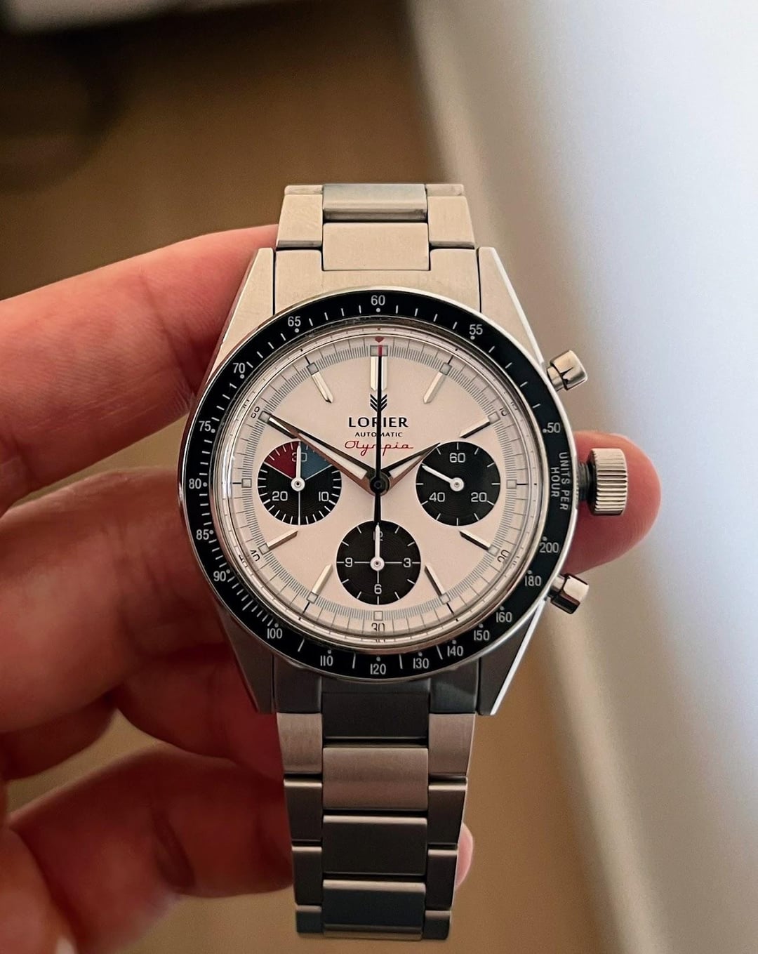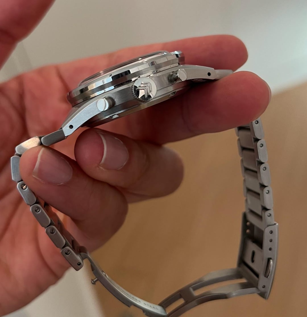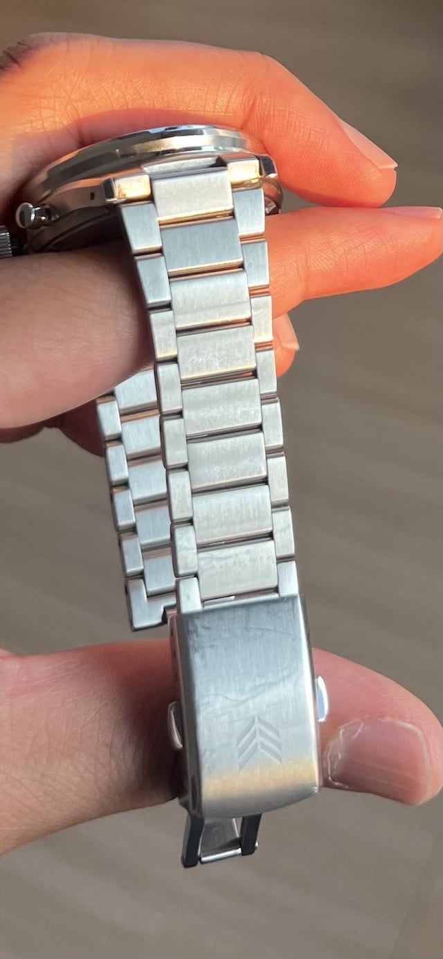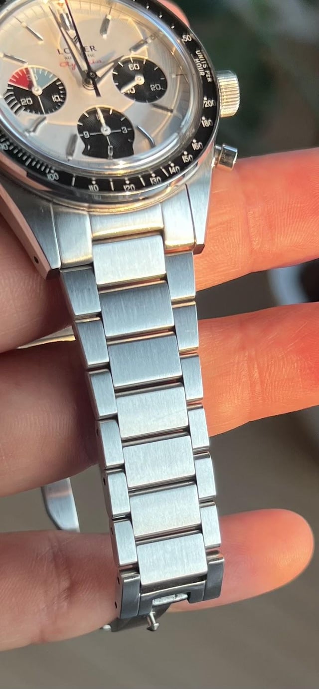 Letting my Lorier Olympia go. The watch comes with the full set - box, papers, polywatch, pouch, case etc. It’s in great condition with the main signs of wear being hairline scratches on the clasp and bracelet (mostly on the clasp). I took a picture of the clasp in the sunlight so the scratches are clearly visible. **Looking to get $780 shipped within the US.** Being totally honest - I’ve never agonized over a sale this much - the watch is spectacular in person and is clearly a big step up for Lorier in terms of design. Also the mechanical chronograph function feels amazing. I’m pretty sure there’s no better automatic mechanical chronograph in it’s price bracket (and I don’t think its close). Unfortunately I made a very irresponsible purchase the other day for a grail piece which also happens to be a chronograph and so this has to go :(. Gallery - [https://imgur.com/a/zvFXUkr](https://imgur.com/a/zvFXUkr)