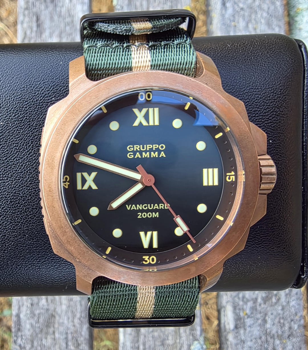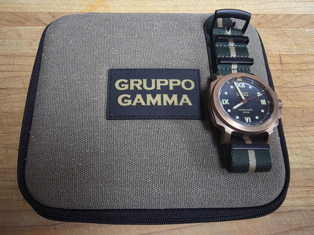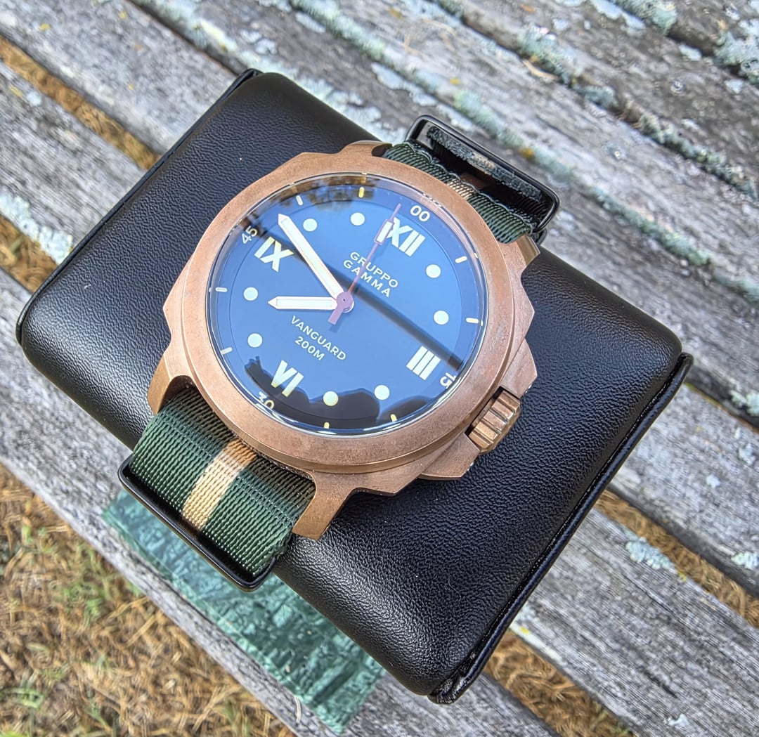 Selling my beautiful Gruppo Gamma Vanguard. It comes with full kit and is great condition. Only asking $500 obo shipped in CONUS. Let me know if you have any questions! Specs:Reference: AN-18 • Movement: Automatic, Swiss made • Caliber: ETA 2824-2 • Case: Bronze • Diameter: 48mm overall including the crown guard; ~44mm just the bezel;~36mm crystal/dial Thickness: 14mm Lug-to-Lug: 52.5mm • Dial: Blue to black gradient with Roman markers • Lume: C3 Super-LumiNova • Crystal: Scratch-resistant sapphire • Band: Black leather strap • Matching Gruppo Gamma tang buckle Lug-Width: 24mm • Crown: Screw-down • Water Resistant up to 200m • Retail Price: Discontinued, unavailable from Gruppo Gamma
