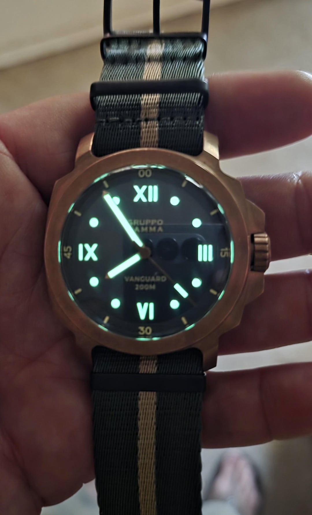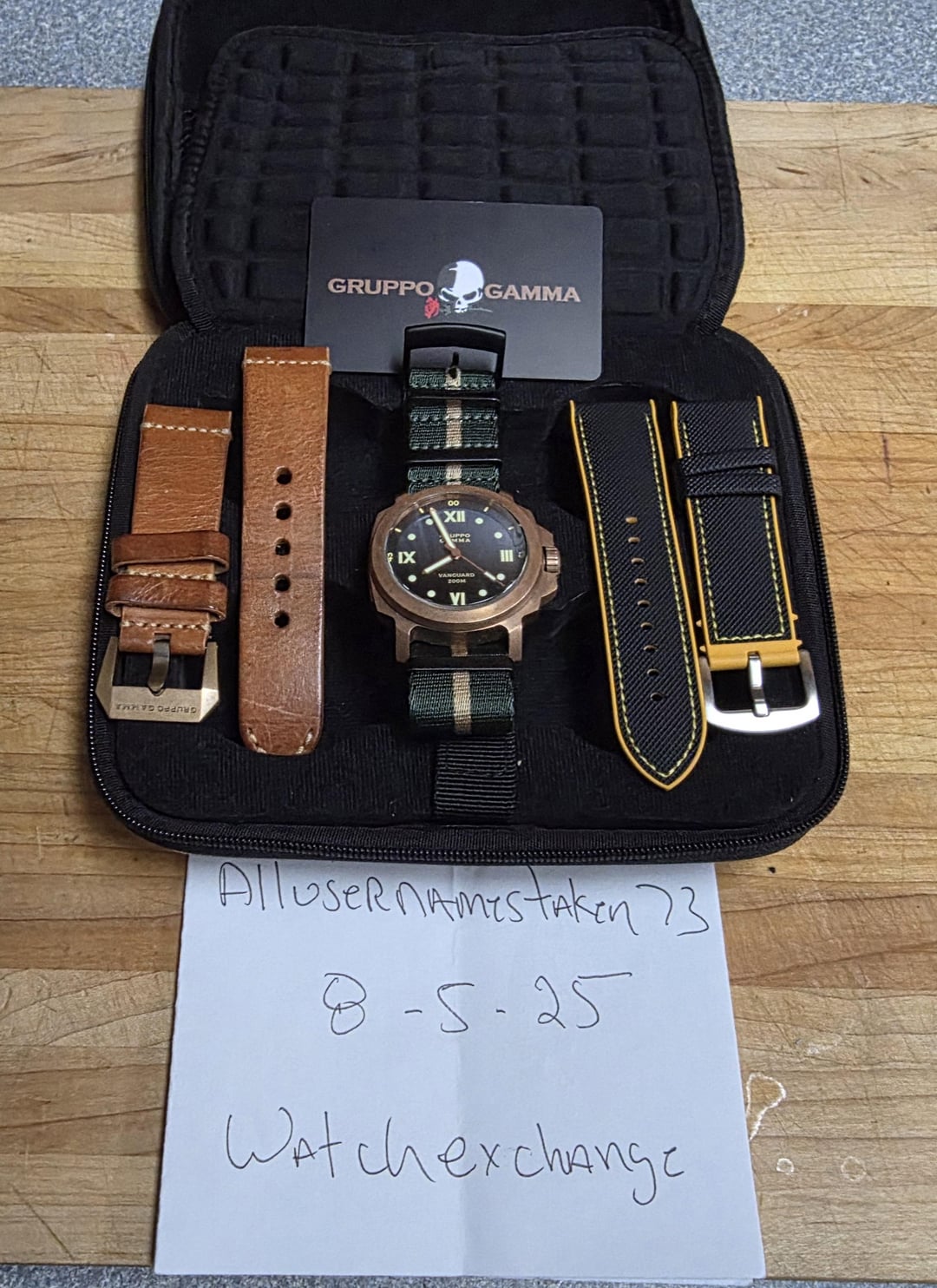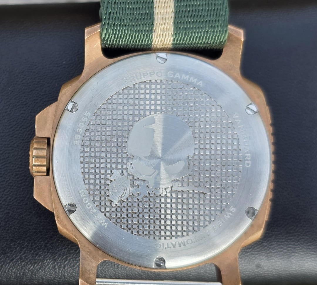 Selling my beautiful Gruppo Gamma Vanguard. It comes with full kit and is great condition. Only asking $500 obo shipped in CONUS. Let me know if you have any questions! Specs:Reference: AN-18 • Movement: Automatic, Swiss made • Caliber: ETA 2824-2 • Case: Bronze • Diameter: 48mm overall including the crown guard; ~44mm just the bezel;~36mm crystal/dial Thickness: 14mm Lug-to-Lug: 52.5mm • Dial: Blue to black gradient with Roman markers • Lume: C3 Super-LumiNova • Crystal: Scratch-resistant sapphire • Band: Black leather strap • Matching Gruppo Gamma tang buckle Lug-Width: 24mm • Crown: Screw-down • Water Resistant up to 200m • Retail Price: Discontinued, unavailable from Gruppo Gamma