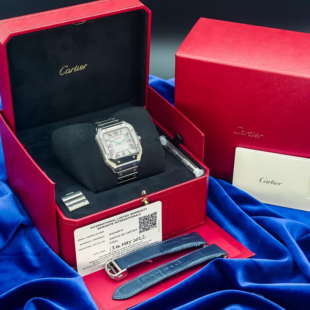 **CARTIER Santos De Cartier Large Steel REF WSSA0018 Complete with BOX & PAPERS** **REF:** WSSA0018 **YEAR:** Dated 2022 **SIZE:** 39.8 mm (Large) **FEAT:** Opaline Dial w/Date, 100m, Automatic, SmartLink Steel Bracelet and Blue Strap both w/ QuickSwitch Interchangeable System. **COND:** Excellent Preowned Cond **LINKS:** Full **INCL:** Complete Set includes Inner/Outer Boxes, Warranty Card, Booklet, Service Tool, Extra Unworn/Unsized Strap/Clasp **$** 6350 + shipping (Retails for $8,250 + tax) **TIMESTAMP:** [https://imgur.com/a/GSuc5cq](https://imgur.com/a/GSuc5cq) **FRANKLIN LUXURY WATCHES:** Located in Nashville/Franklin TN 110% Authenticity Guarantee 3-day Return Policy 12-mo Warranty **BUY WITH CONFIDENCE:** Countless 5-Star Reviews Across Several Platforms including Google **FOLLOW-US:** [franklinwatch.com](http://franklinwatch.com) IG: u/FranklinWatch LOCAL MEET-UP OR FULLY INSURED FEDEX NEXT DAY SHIPPING AVAILABLE!!! (SIGNATURE REQUIRED)