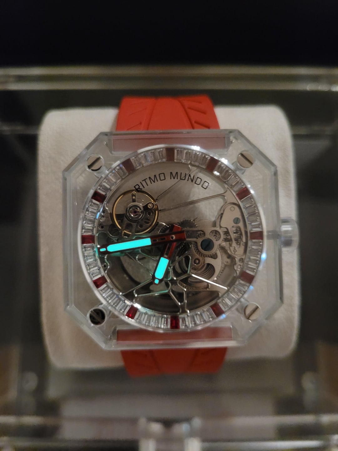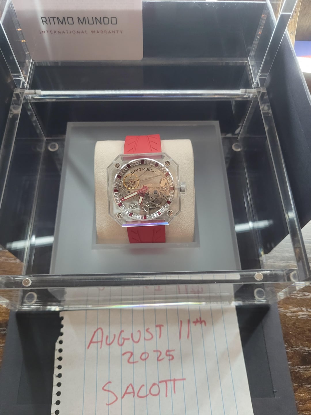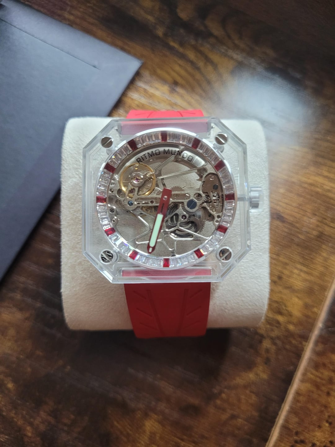 Pegasus Red Stone Red and White Accented Square Shaped Skeleton Automatic Movement in a mono sapphire crystal case. Clear Silicon Strap and see through back with 3 ATM water resistant. Model 3101-003 Case size: 44 mm Skeleton Dial Thickness: 11.3 mm Crystal type: Sapphire Movement: Automatic Movement Bracelet Type: Silicone Water Resistance: 3 ATM Features: Luminous Power Reserve Condition: Brand new, only worn when taking photos. 💰 Price: USD $3,900 OBO OR BEST OFFER!!! Sorry no trades at this time. 💳 Payment Method: Zelle, Venmo, PayPal F&F Hello Watchexchange, I bought this brand new Ritmo Mundo Pegasus Red Stone at MGM Gift Store. My intentions were to resell it because I used my comp points to purchase this watch. Never has been worn. I asked the lady at the store if it came with any booklets. They said they will give me a call in 1-2 days to see if it came with a booklet. Will update when they do. I have sold stuff on here on reddit, if you check my history its mainly PC parts.