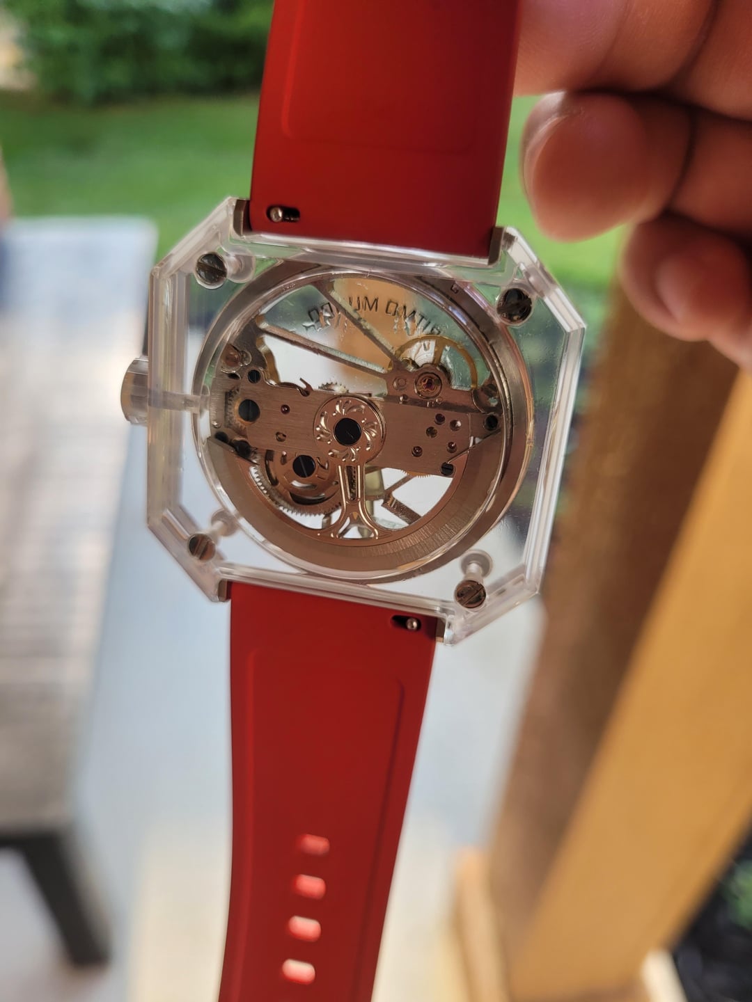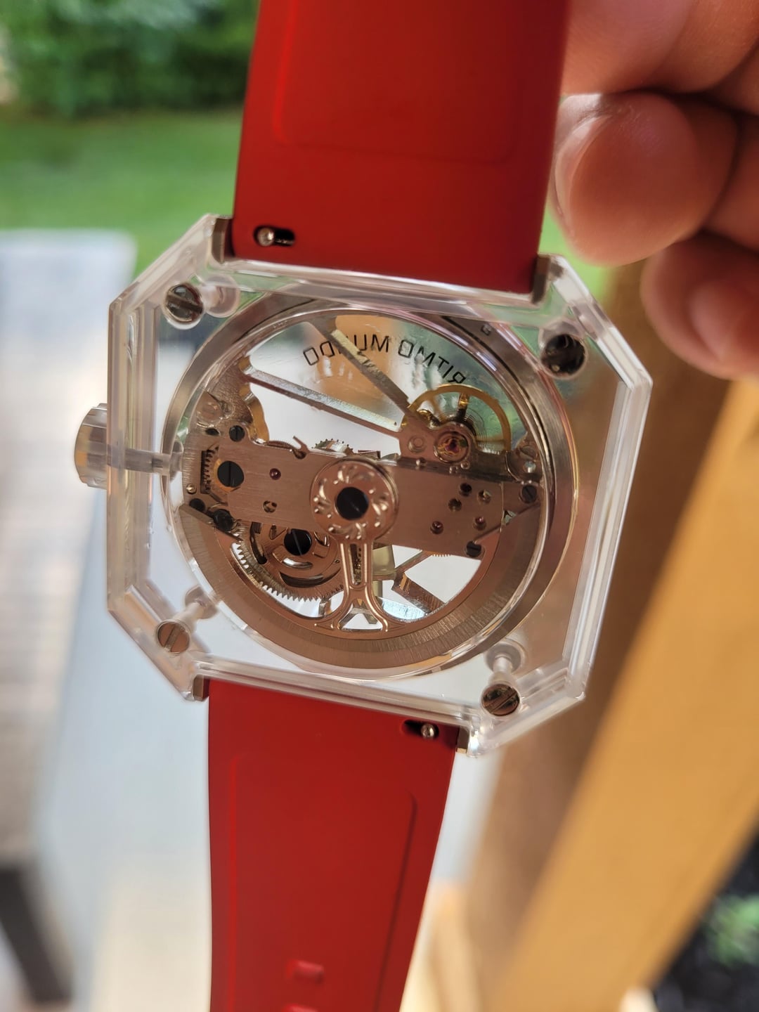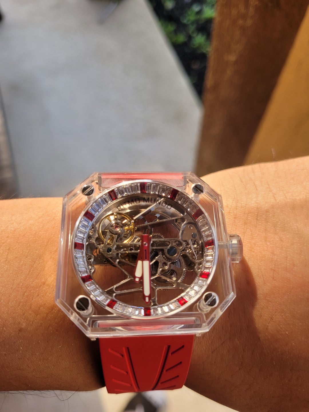 Pegasus Red Stone Red and White Accented Square Shaped Skeleton Automatic Movement in a mono sapphire crystal case. Clear Silicon Strap and see through back with 3 ATM water resistant. Model 3101-003 Case size: 44 mm Skeleton Dial Thickness: 11.3 mm Crystal type: Sapphire Movement: Automatic Movement Bracelet Type: Silicone Water Resistance: 3 ATM Features: Luminous Power Reserve Condition: Brand new, only worn when taking photos. 💰 Price: USD $3,900 OBO OR BEST OFFER!!! Sorry no trades at this time. 💳 Payment Method: Zelle, Venmo, PayPal F&F Hello Watchexchange, I bought this brand new Ritmo Mundo Pegasus Red Stone at MGM Gift Store. My intentions were to resell it because I used my comp points to purchase this watch. Never has been worn. I asked the lady at the store if it came with any booklets. They said they will give me a call in 1-2 days to see if it came with a booklet. Will update when they do. I have sold stuff on here on reddit, if you check my history its mainly PC parts.
