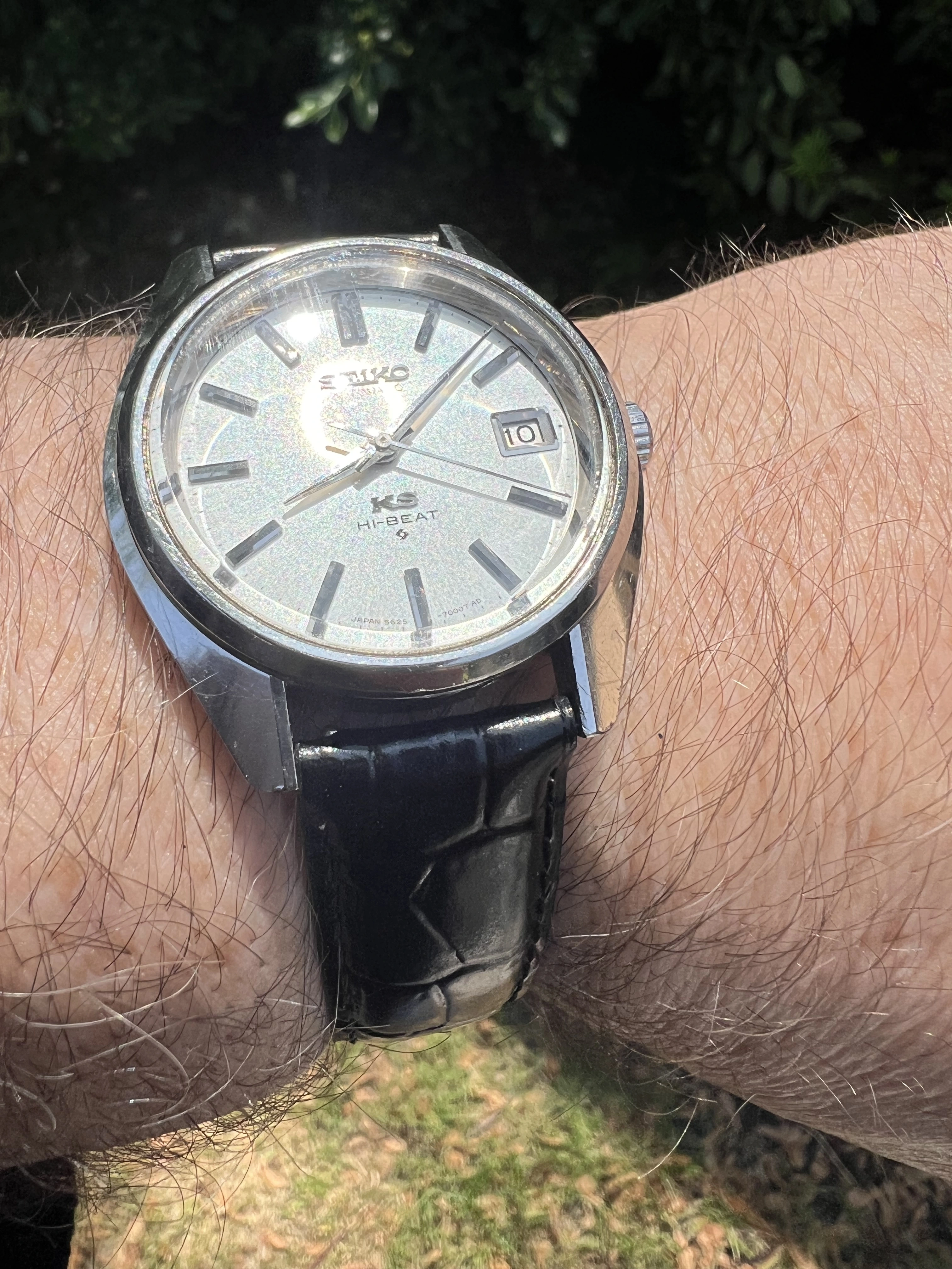 Dial: Original sunburst dial is near perfect condition no visible marks. Stainless hour markers with black inserts, Applied SEIKO and KS, Suwa logo, all text correct and excellent. Date window 3:00 date turns over at MN and quickset functioning as it should.