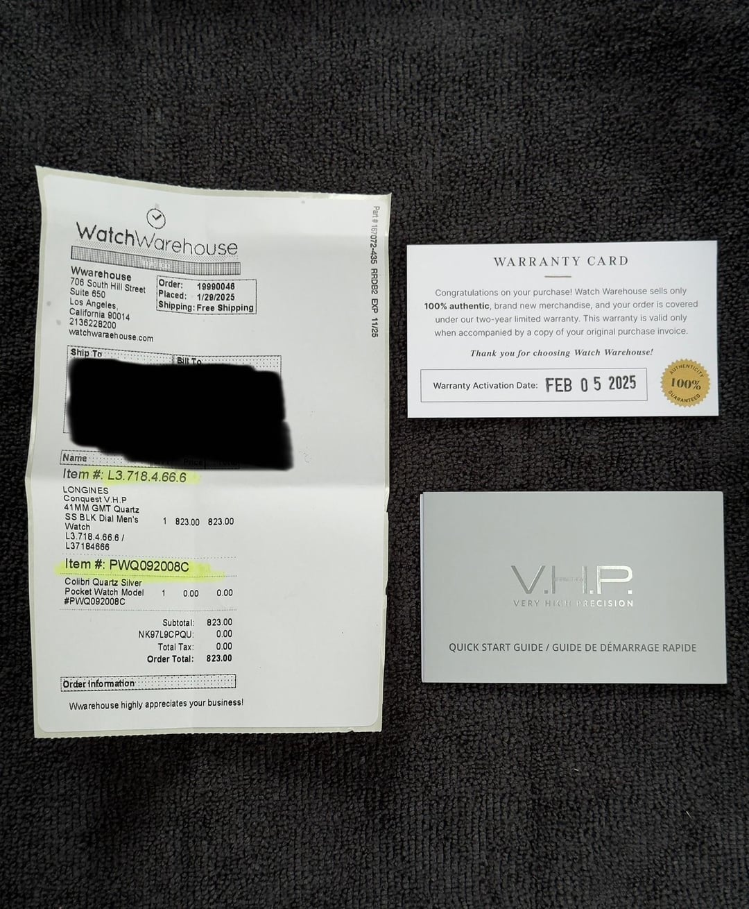 Longines Conquest VHP 41mm GMT Timestamp: https://imgur.com/gallery/longines-conquest-vhp-41mm-gmt-4eaI4m3 Model: L3.718.4.66.6 Description: Gently Worn, comes with original box, and WatchMaxx warranty with receipt. Brand: LONGINES Series: Conquest Movement: VHP Quartz Case Size: 41 mm Case Material:Stainless Steel Dial Color: Black Dial Type/Hands/Markers: Analog / Silver / Index Crystal: Scratch Resistant Sapphire Band Material: Stainless Steel Band Type: Bracelet Clasp: Push Button Folding Clasp Functions: Date, Hour, Minute, Second + Perpetual Calendar + Crown Push Home & Travel Time Zone Change + App to set time using phone flash Water Resistance:50 meters / 165 feet Total Price: $470 (Includes free shipping in CONUS) Payment: PayPal FF, Venmo, Zelle