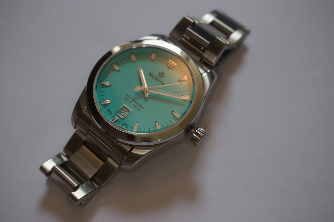 Up for sale I have a Monta Noble in the limited turquoise color in very good condition. Monta M-22 movement (Sellita SW300) keeps excellent time. Case is 38.5mm wide and a very thin 9.7mm thickness, lug width is 20mm. Lug-to-lug is 47mm. Stainless steel case and bracelet. Water resistance is 150m with a screw down crown. Fits great on my 7.25" wrist. I get more compliments on this watch than any other I've owned. Watch is in very good condition with some small scratches on bracelet clasp, and normal wear on the bracelet, but clean on case sides, bezel, and crystal as pictured. The watch comes with all original packaging and links for bracelet. Selling to fund another purchase. $1350 PayPal or Venmo (+3% for PP G&S) shipped via USPS Priority Mail.
