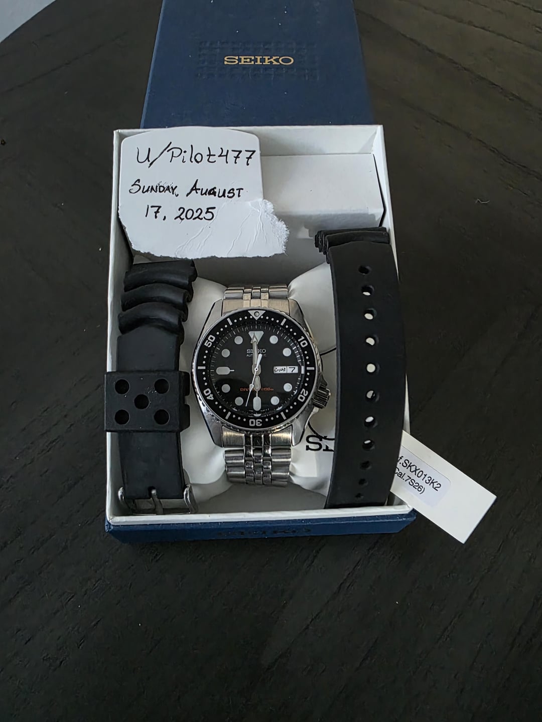 Selling my Seiko SKX013 with 4r36 movement swap (hacks and handwinds). The crown and stem were also swapped to accomadate the new movement, so the it comes with the "S" signed crown. Other than that the watch is original. It comes with its original Seiko Jubilee and an original Seiko rubber strap I sourced. All extra links will be included along with Seiko box and hangtag. Does NOT come with manual nor the 7s26 movement, original crown. The watch runs great, within specs. Selling as I dont really wear it and would much rather get a SKX007. Asking for $320 shipped within the states. Will take PayPal, Venmo, or Zelle. Thanks for looking! [Timestamp/Album](https://imgur.com/a/RGMGxdt)
