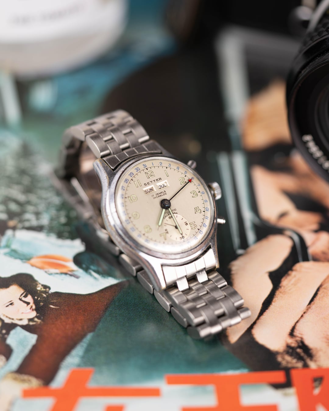 Up for sale is a Greygor Setter Triple Date vintage watch, a charming and highly functional piece from the golden era of Swiss watchmaking. This classic calendar complication includes day, date, and month displays, as well as a central pointer date hand and a running seconds subdial. With its brushed silver dial, bold lumed Arabic numerals, and well-balanced layout, this Greygor Setter evokes the look of triple-date watches but in an affordable, automatic format. The stainless steel case features squared lugs and thin pushers that give it a utilitarian flair. **Key Features** * Brand: Greygor (Setter model) * Origin: Swiss Made * Case: Stainless steel, \~34–36mm (approx.) * Dial: Silver with black Arabic numerals, triple calendar display (day, date, month) * Movement: Automatic, 17 jewels * Strap: Aftermarket steel bracelet (can be swapped for leather upon request) * Condition: Light honest wear throughout, clean original dial, pushers and crown operate smoothly Please reach out if you want to see this or any other watch over FaceTime. See all pictures for details and timestamp. Feel free to message, comment, or PM me any questions you may have. Shipping is included in the United States. I accept most forms of major payment. For more vintage watches and first dibs on affordable pieces follow my Instagram at: [Ar.ro.ws](https://www.instagram.com/ar.ro.ws/) If you would like a payment plan I do accept Klarna [here on my website](https://www.arrowsvintage.com/shop/p/greygor-setter-triple-date).