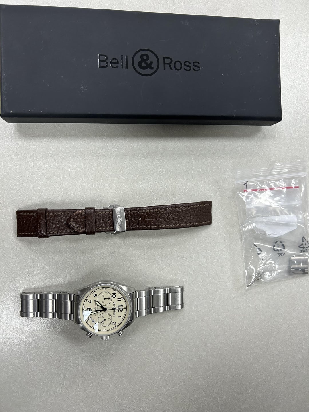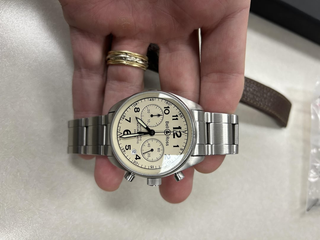 BR126 Vintage 39mm Cream Dial- ETA 289xx Automatic Chrono Movement Anti-Reflective, scratch free sapphire crystal, beautiful open sapphire caseback, antimagnetic, 200m of water resistance Comes with: deployant clasp + leather band, factory 126 bracelet purchased from B&R in 2024 + extra link Priced at 2,500, open to offers as well as TDR trades. Any other questions, please feel free to ask! Thank you,