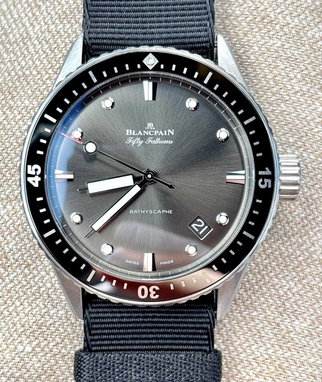 This watch is amazing and a great entry into high horology, but looking to change things up a little. I have a recently fully overhauled by BP, full set with extras, and under warranty until 11/11/27 (SGUS gave me an extended warranty for 3 years) Blancpain Bathyscaphe 43mm in Meteor Grey. Model 5000-1110-B52A. Originally sold by Bhindi Jewlers in 2014. The watch is in excellent condition with very minimal signs of wear. Crystal and bezel insert have no scratches at all. Bezel lines up at 12 and has a few tiny dings, primarily at 45 and 60 mark but not overly apparent. Case has a couple of hairlines and light scuffs which don't even come out in pictures. You really need to search for them. No strap change marks. Comes with OEM NATO plus 2 sizes of OEM Sailcloth strap for a perfect fit. One piece of each strap remains completely unworn. The worn pieces are in good shape. Running at \~+0.5 spd and is easily the most precise watch I’ve owned. Lug to lug is about 49mm, so it's very wearable and wears smaller than the dial size would suggest. I have a \~6.75" wrist and the lug tips are nowhere near the edges of my wrist. Asking **$6,400 OBRO** via PP or other methods can be discussed, and shipped fully insured. This is the lowest priced example right now compared to others that are out of warranty and that don’t include 3 straps. Local pickup is fine in the Chicagoland area and I'm willing to knock off more from the price. Same if you provide your own label. **Trades: my Bathy plus cash for a Rolex 16600, 14060, 224270, 214270, 114060, or JLC Polaris/Mariner Date.** Not interested in any others at the moment. Message me for more pics/video or questions. I respond to everyone. I am more active on WUS and you can find plenty of feedback there under the same handle. Thanks for looking.