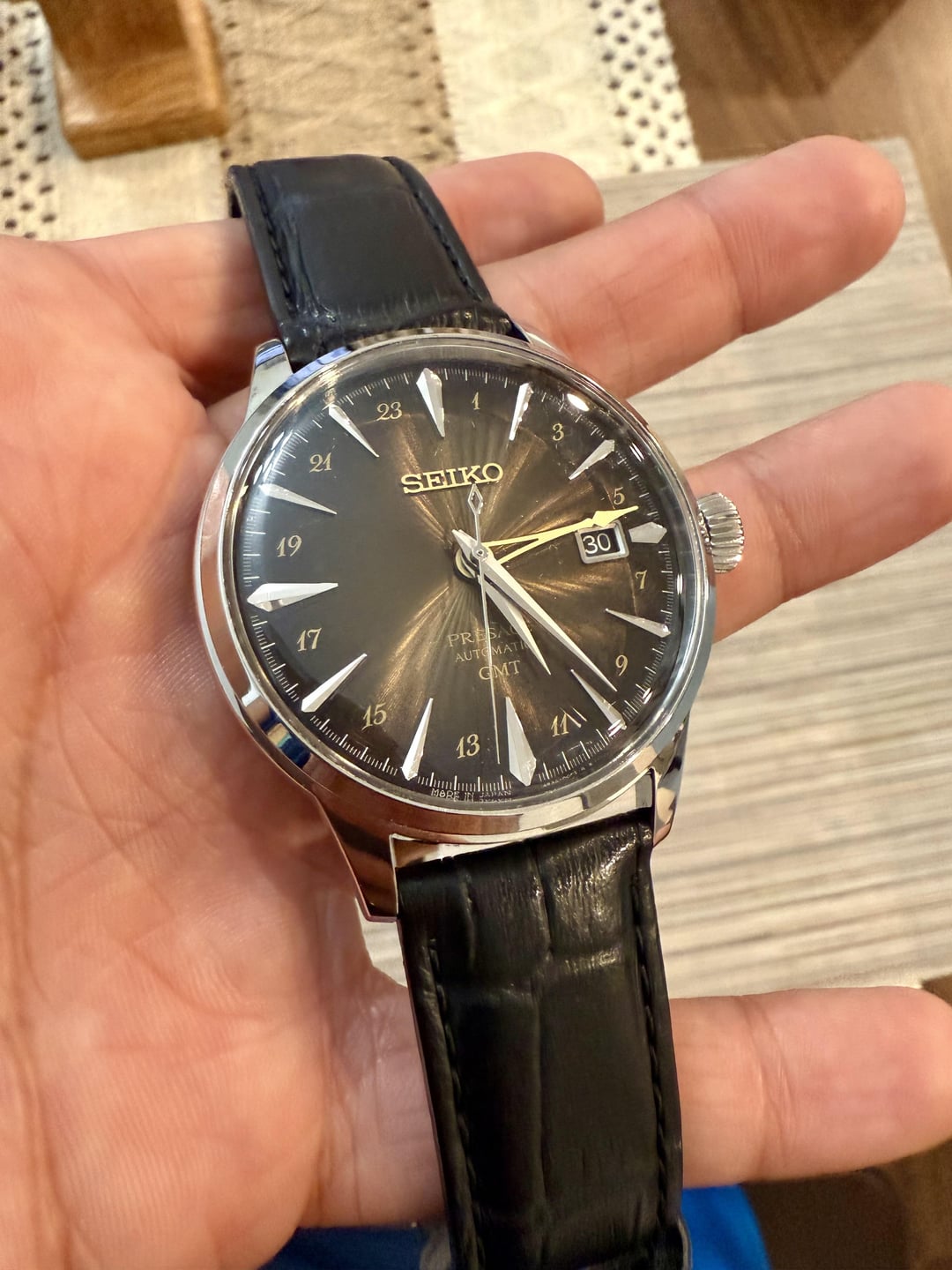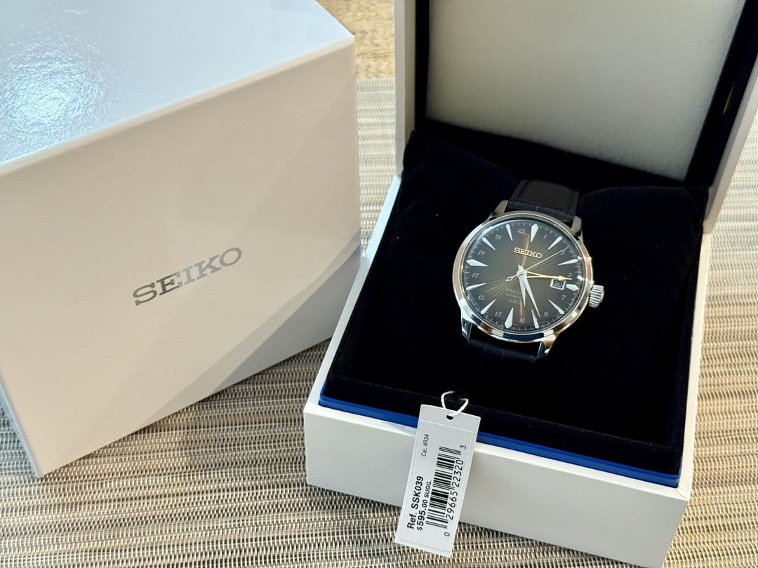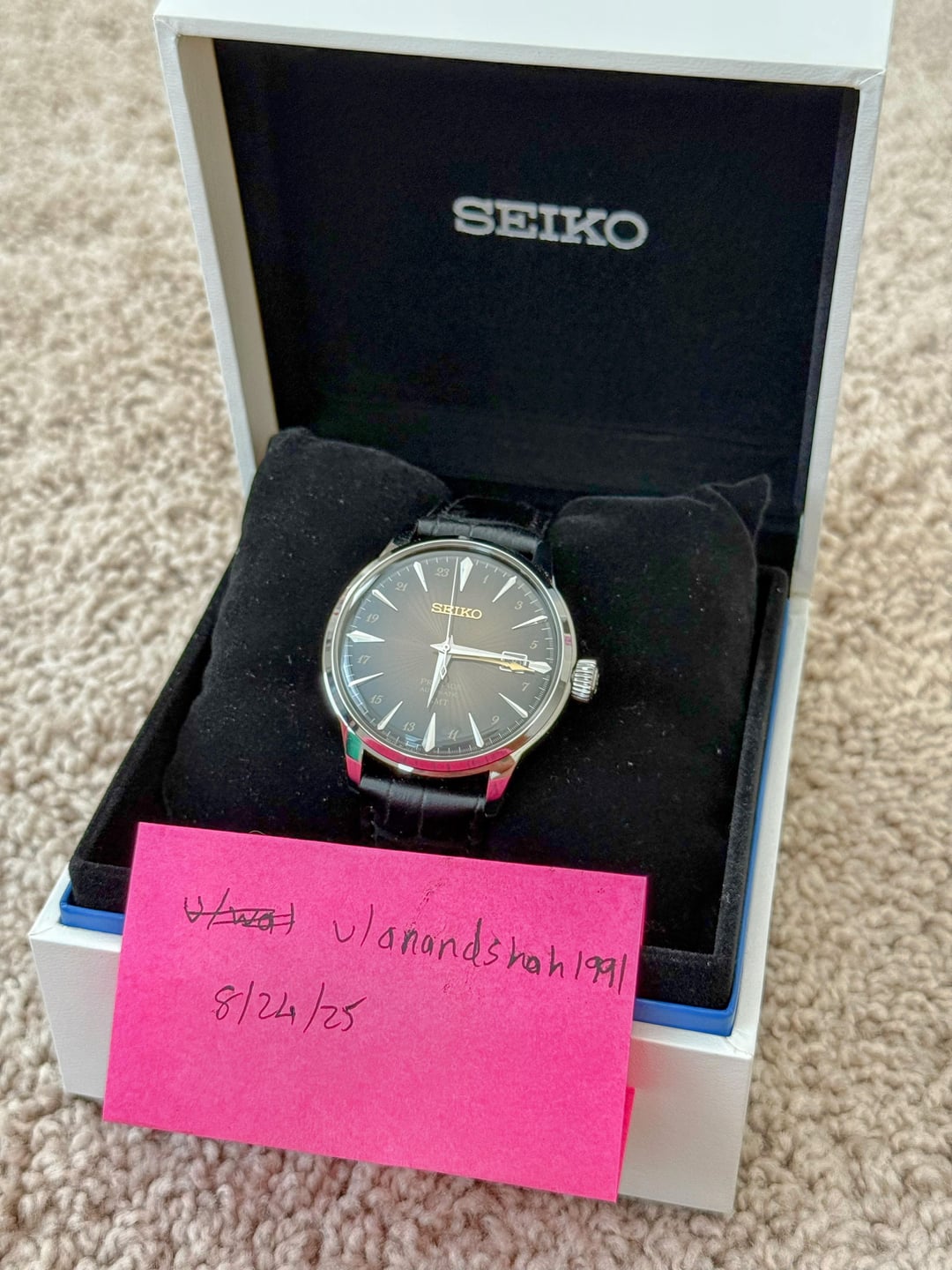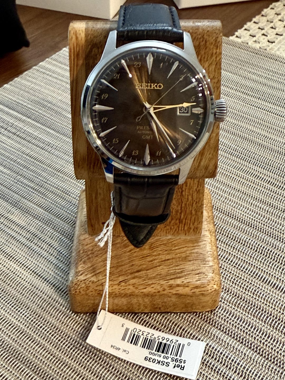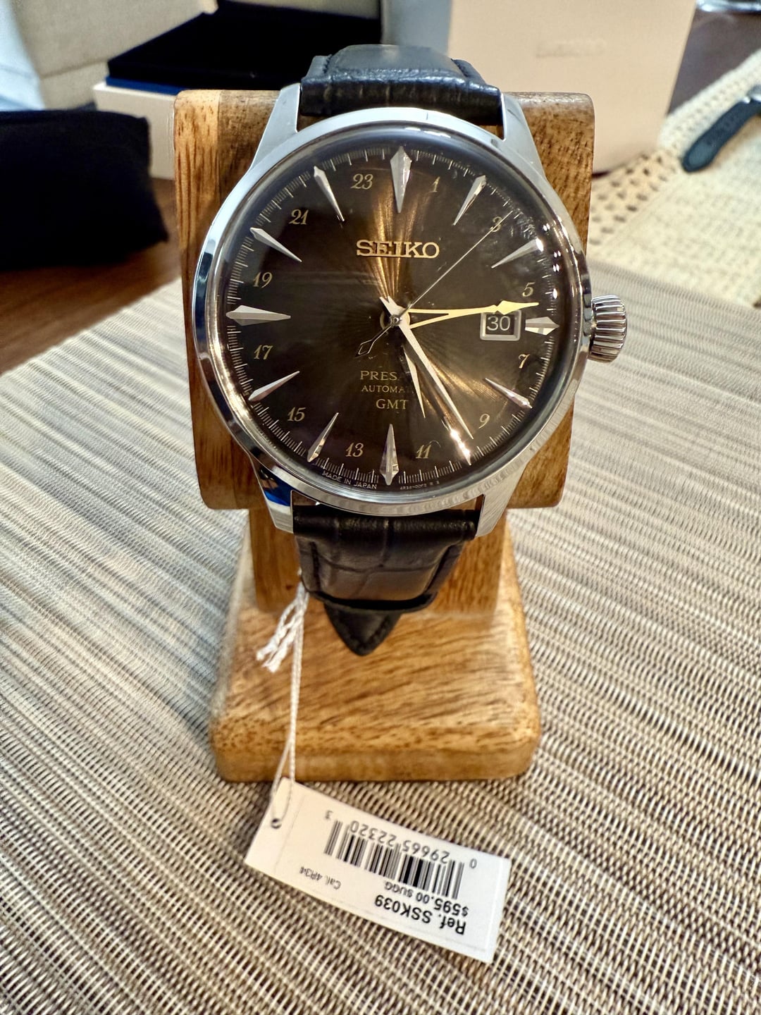 Going through a collection sell off to fund a major purchase. Please check out my other listings! Happy to combine sales for a discount. Anyone who purchases more than two watches will receive the Casio A158 for free Up for sale is a brand new Seiko presage cocktail time GMT SKK039. This particular example is brand new. Comes with full kit Quick Specs: Ref: SSK039 Retail: $595 plus tax Case Material : Stainless steel Diameter : 40.5mm Thickness: ~12.8mm Lug to lug: 47.5mm Glass : Box Hardlex Dial: Brown Sunday dial with gilt GMT habd Movement: 4R34 caller GMT Power Reserve: 41 hours I’m asking for $415 shipped from USA. Zelle preferred, wise, PP F&F/Venmo also accepted. References: please check out my feedback https://watchcharts.com/repcheck/watchuseek/anand.shah1991/feedback AND https://watchcharts.com/repcheck/reddit/anandshah1991/feedback I am comfortable with FaceTime calls and in person transaction in upstate SC area