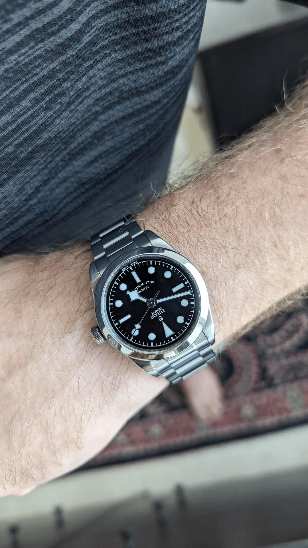 For sale is a well-loved BB36 black dial sold in June of 2019 that comes on bracelet as well as with a nice 19mm Delugs leather strap! Condition wise I would put this watch at 70-75%, this was clearly a daily wearer for someone and a polish job was done at some point in the past. There are some surface scratches and pitting in the case, very light dings in the bezel and a few larger dings in the lug at 5 o’clock. There are a few micro specks of dust under the crystal and a very faint piece of dust on the dial between the 2 and 3 o’clock markers, all of which is really only visible using a loupe or macro lens. I believe the bracelet was also polished in the past. It should fit up to a 7.2" wrist snugly, however you can buy half links for this bracelet from Uncle Seiko for like $30! I did my best to capture the condition in the photos but let me know if you would like to see others. With all of that transparency, here is the good: \- The watch wears and presents beautifully, especially if you plan to daily drive it and put your own dings on it, or plan to have it re-polished at some point after you own it. \- This “Smiley Dial” is discontinued and is becoming more collectible by Tudor fans. \- The watch was fully serviced by Rolex in February 2023, brokered by Lenkersdorfer in VA and it is running beautifully within COSC specs. \- It comes with the box, all paperwork and purchase/warranty card, as well as the paperwork from the recent service by Rolex. It will also come with a beautiful brown Delugs leather strap with quick change bars. **I am asking $1,780 net to me, including insured shipping in CONUS.** via PayPal G&S. No trades. Thanks for looking.