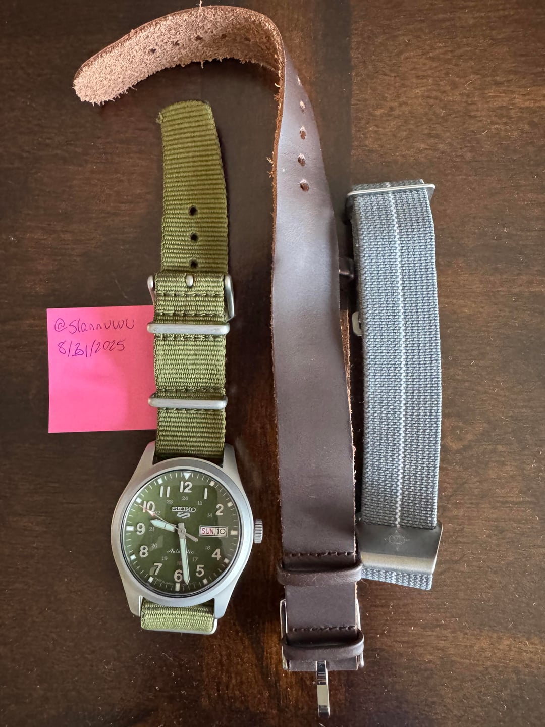 Hello all, Up for sale is the first watch i ever purchased. My seiko srpg33. It is in perfect working condition. Winds great, keeps time within expected range for a seiko 5, and still has its original band plus a few extra straps. Cosmetically it’s got a few dings. The chip in the crystal is purely cosmetic. It is still water proof up to 100m and doesn’t have any water damage. All signs of wear and tear are shown in the pictures. Price: $150 Shipped in US only. Prefer Zelle but will consider paypal or venmo.