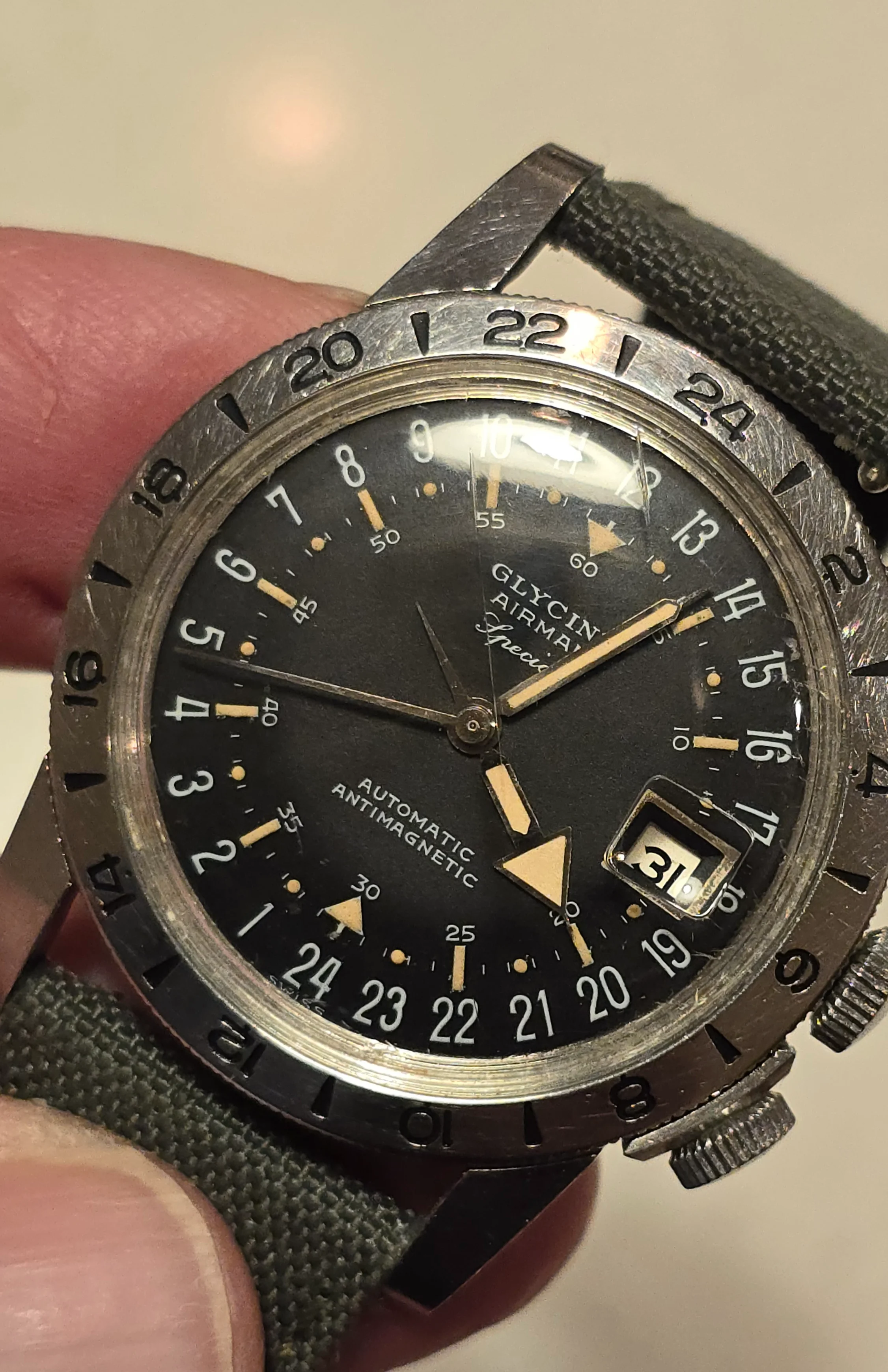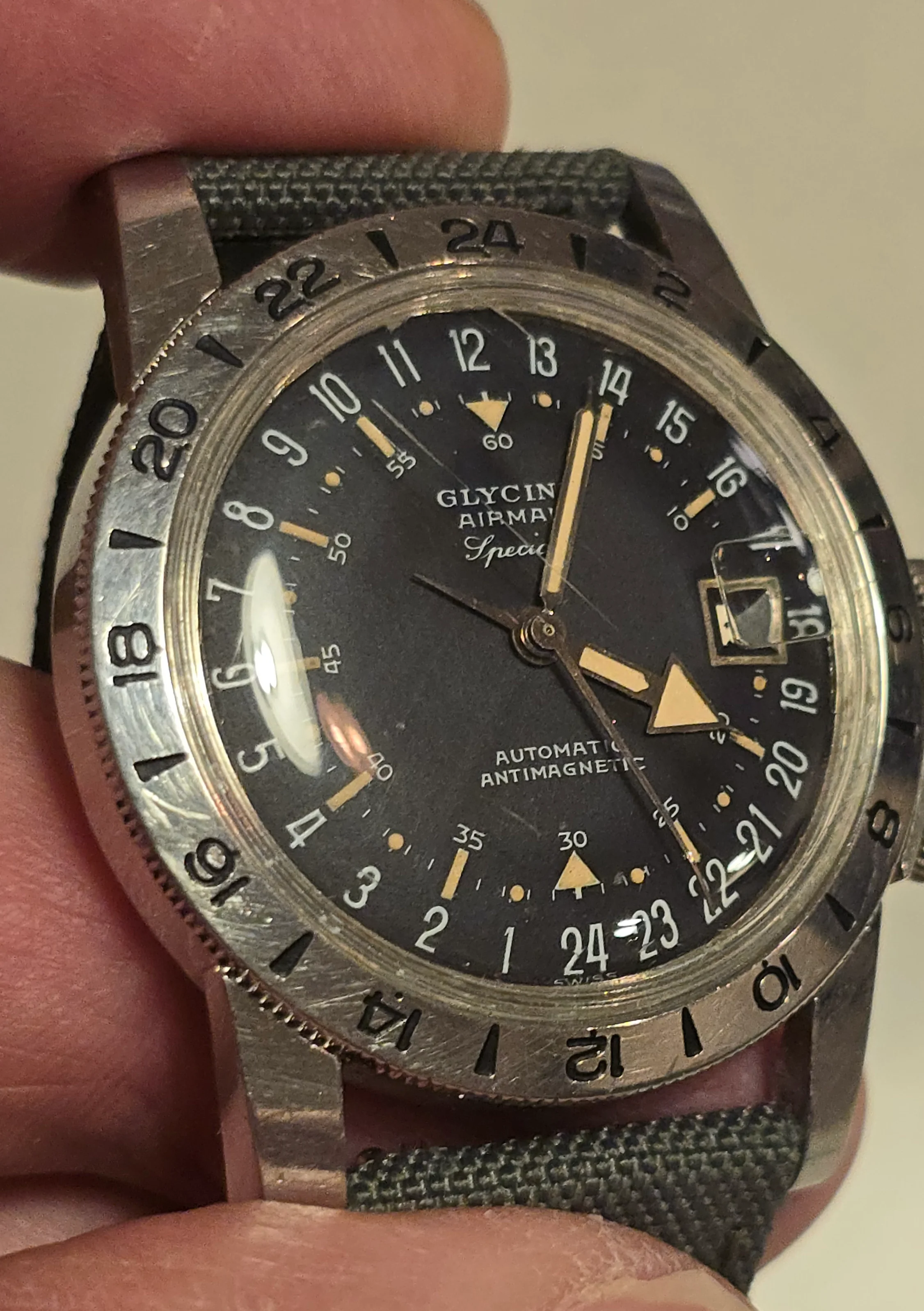 Emre told me that Glycine Specials were sold in military Post Exchanges. We don't know why these 1956 batches were produced with the 12 on top, versus the standard 24 on top. But here we are.