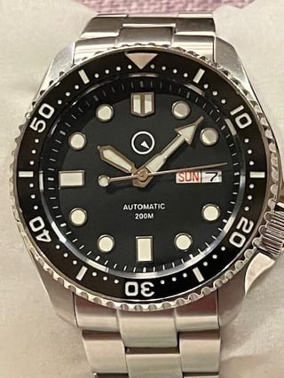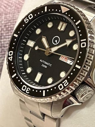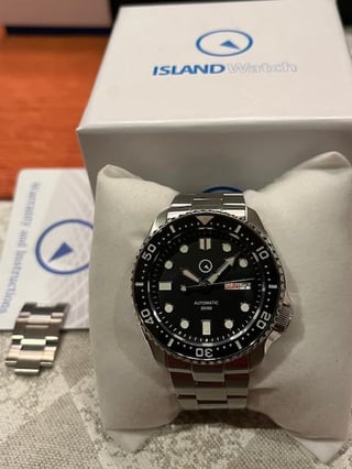Islander Automatic Dive Watch with Solid-Link Bracelet, AR Sapphire Crystal, and Luminous Ceramic Bezel Insert #ISL-02 Selling my Islander ISL-02 Diver. Watch is in great condition, with some minimal desk rash on the clasp. Case and crystal are scratch-free. Info from the Long Island Watch website: Island Watch would like to introduce you to the new Islander dive watch. You will immediately notice that is has a very familiar 43mm case with an offset screw-down crown at 4:00. Thickness is 14mm and tip to tip it is a very wearable 46mm (i.e. looks big, but doesn't wear big on your wrist). Note that the lug ends are drilled for easier bracelet to strap changes. The case back has an embossed lighthouse scene. Inside the case is an NH36, 24-jewel automatic movement with 21,600 vibrations per hour. This self-winding movement supports hand winding and hacks (seconds hand stops when you pull out the crown). Power reserve is about 41 hours fully wound. The NH36 also has both a day and date wheel viewed at 3:00 on the dial. The BLACK dial has SuperLuminova on the hands and hour makers and the Island Watch logo is luminous under 12:00. The 120-click uni-directional bezel has a scratch-resistant black (diver marked) ceramic insert that is also treated with SuperLuminova for a maximum glow-in-the-dark experience when lights go out. It is quite bright and long lasting. The BLACK dial has enhanced visibility due to the use of an anti-reflective flat sapphire crystal that also guards against scratches. The anti-reflective coating is on the underside of the sapphire and it imparts a bluish hue at some viewing angles. (the dial is black.) And, lastly you get a beefy bracelet with solid links, solid end links and a dual push-button flip lock deployant clasp with three position micro-adjustment. For sizing the bracelet, you will find screws are used for removing bracelet links instead of pins. NOTE: The Islander dive and dual-time watch is compatible with aftermarket parts available at Island Watch (and elsewhere) for the SKX007 models, such as crystals, bezels, inserts, chapter rings, dials, hands, bracelets, etc. I am asking for $175, which includes full kit and the extra links. Shipping to CONUS is included in the price. I accept PayPal F&F, Venmo, and Zelle. If using PayPal G&S, please add 4.5% to the price. Please let me know if you have any questions.
