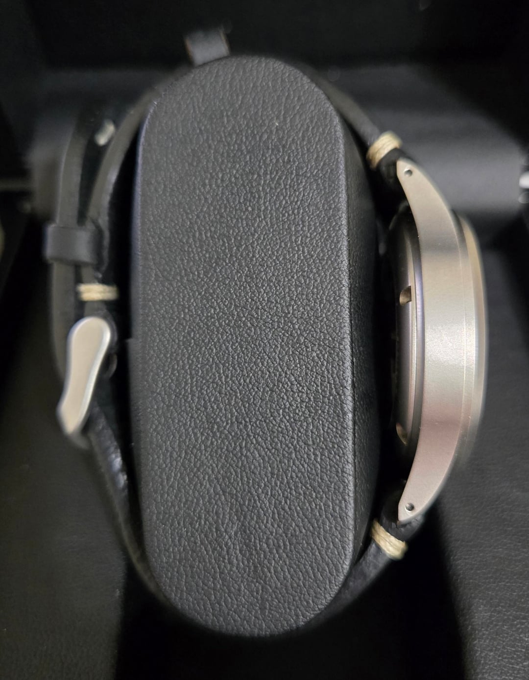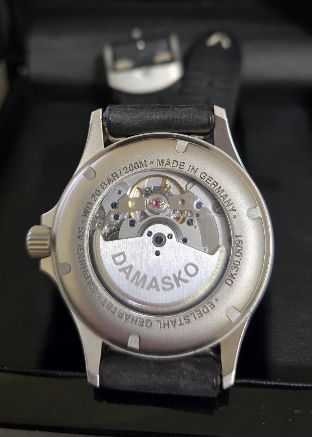 Damasko DK30 39mm x 9.95mm In house Damasko A26-1 movement Submarine steel, surface hardened 200m water resistant Factory black leather strap with signed buckle MSRP $1498 Watch is in excellent condition except for several marks to the external AR coating. I've tried to capture them on camera, see last image, but they're hard to get on the image. Asking $899