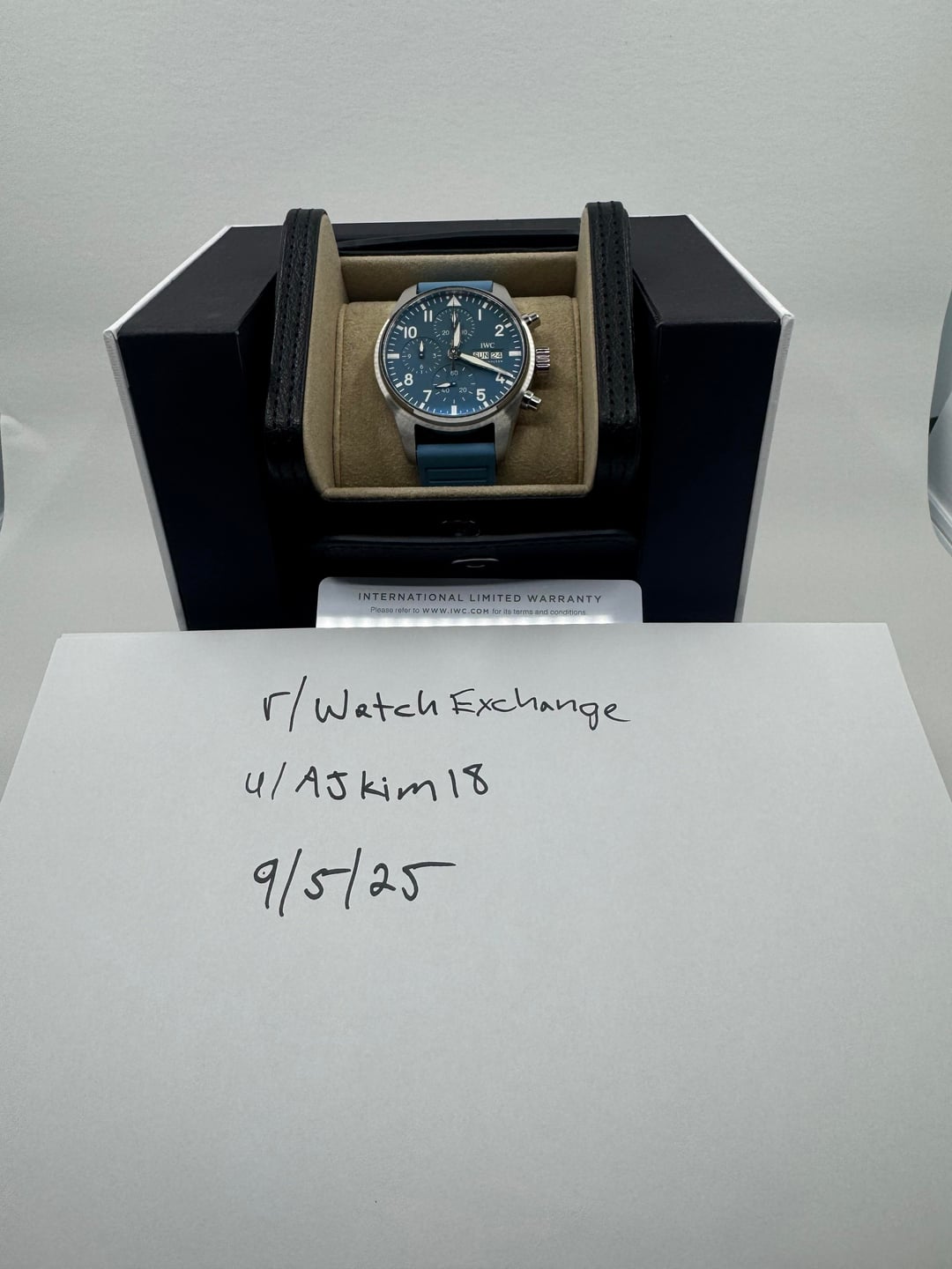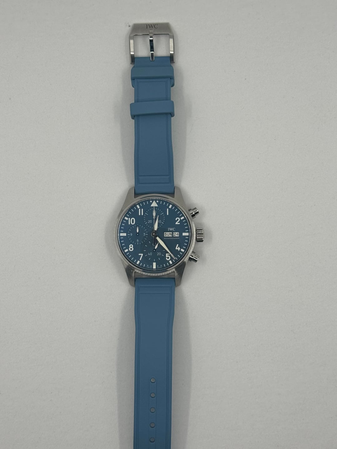 Up for sale is an IWC Pilot’s Watch Chronograph Light Blue 41mm (Ref. IW388117) **Size:** 41mm **Reference:** IW388117 **Power reserve:** \~46 hours **Water resistance:** 100M, screw down crown **Case material:** Stainless Steel **Strap:** Original matching rubber strap **Condition:** The watch is in mint condition. No scratches and very light strap wear, but plenty of life left. Runs strong with no issues. Comes with box and papers. **Pictures/Timestamp:** \[Above\] **Price:** **$6,250 shipped** (fully insured in the continental US). Payment via Zelle or Bank Wire only. **No PayPal (no exceptions).** **Trades:** No trades at this time.