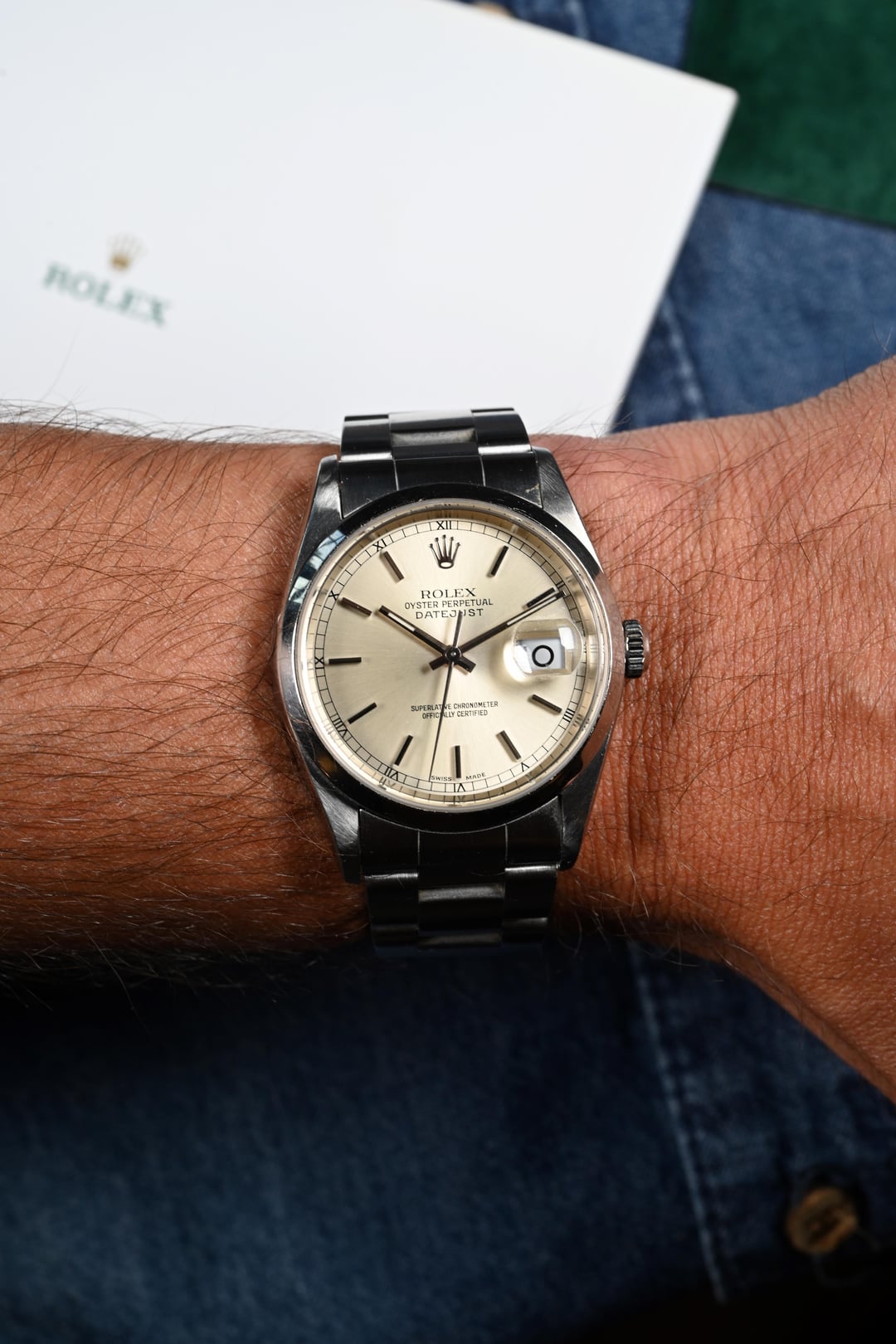 **ABOUT THIS WATCH:**  **MANUFACTURER:** Rolex **MODEL:** Datejust **REFERENCE:** 16200 **SERIAL:** K Serial **YEAR:** 2000 **DIAL:** The original silver sunburst dial is in great condition. The dial appears to be free of any patina, scratches, blemishes or otherwise imperfections. It features stick hour markers and baton hands.  **CASE:** The 36mm stainless steel case is in good condition. The case overall presents with light wear from use. It features a polished smooth steel bezel making it just a tad bit more under the radar than its fluted bezel DateJust cousins.  **MOVEMENT:** The movement received a full service from Rolex in 2017. The movement can be serviced again for approximately $325 plus parts - if any are needed. If the watch is serviced it will come with a one year warranty dated from the completion of service.  **BRACELET:** Comes on its original oyster bracelet with DE clasp code correlating to year of production in 2001 matching the watch. It presents with light signs of wear. It has 4 screw links in total.  **ACCESSORIES:** An original Rolex service pouch, Rolex service pamphlet in Italian and Rolex Service Card.  **BOX/PAPERS:** None.  **WARRANTY:** None unless serviced first. If serviced the watch will come with a one year warranted dated from the completion of service.  TIMESTAMP: In photos. **BANK WIRE PRICE:** $4,700 shipped.