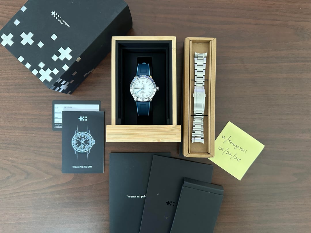 Up for sale is my Christopher Ward C60 Trident GMT 300 (SKU: C60-40AGM31S0BW0-B0). This watch is in excellent condition, and comes with the full kit, including the OEM bracelet and rubber strap. Details: • Case: 40mm stainless steel • Movement: Swiss automatic GMT • Includes: Full kit (box, papers, extra strap, tools) This is a catch-and-release for me — it’s a fantastic watch, but I’m moving in a different direction. The watch has been carefully worn and shows minimal signs of use. Payment via PayPal F&F or G&S (buyer covers fees). Shipping fully insured via UPS. Please feel free to ask for additional pictures or details.