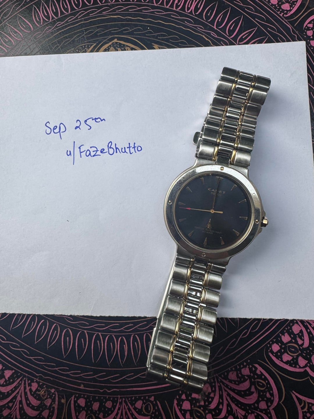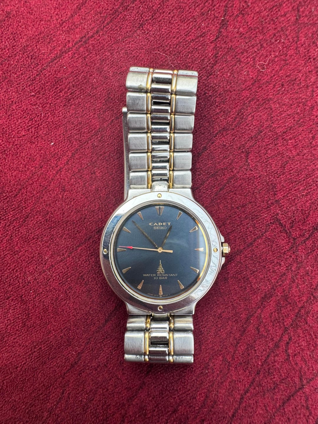 Up for sale is this Seiko Cadet featuring a beautiful midnight blue sunburst dial and a simple stainless steel two-toned case. This example from the 80s features dagger indices with sword hands, with a red painted tip on the seconds hand. The dial also features the Cadet emblem. The watch comes with an integrated two-tone original Cadet bracelet with Cadet embossed on the buckle clasp. The quartz movement is keeping time perfectly. The watch has scratches which can be seen in the pictures. It can fit up to a 17mm wrist (18mm maybe but you’ll end up on r/handwatch). Dimensions: 36mm with the crown. Scope: Watch Only. Price:$110 (OBO) Payment: PayPal F&F Shipping: FedEx