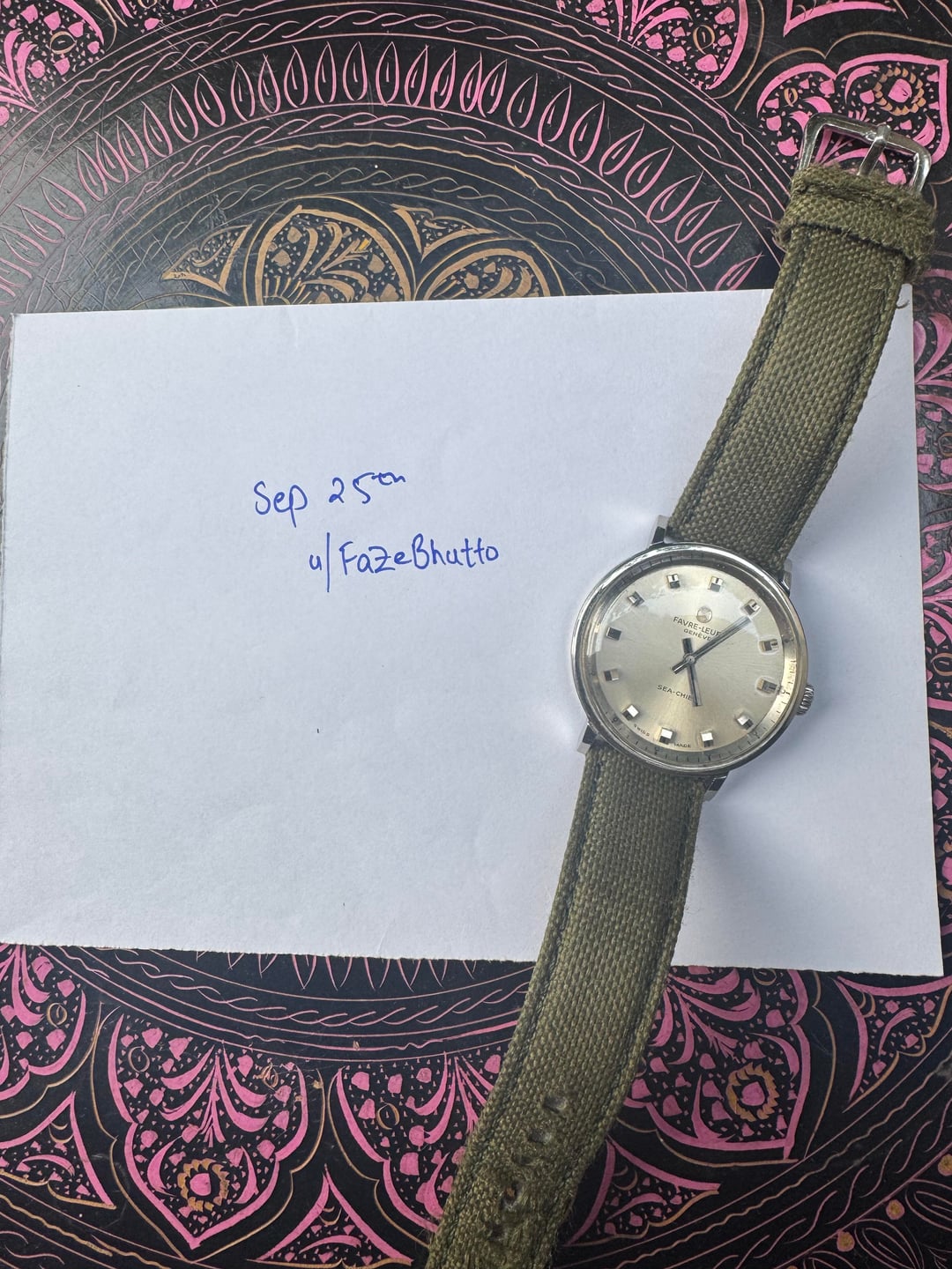 *Reduced* Up for sale is this vintage 1970s Favre Leuba Sea Chief ref. 61513 featuring raised box indices and baton hands. This example has a Twin Power movement which I haven’t seen in a lot of other Sea Chiefs, making it slightly rare. It is a Cal. 253 Twin Power Hand-wound movement which is working perfectly with a 36hr plus reserve. It has a light champagne coloured sunburst dial which looks stunning with the domed crystal featured on this watch. It comes with an after market green cordura/fabric strap which pairs beautifully with the Champaign coloured sunburst dial. The strap comes with a standard pin buckle. Note: A timestamp is attached, but custom timestamps will be provided upon request. Dimensions: 33mm across Scope: Watch only Price: $169 (OBO) Payment: PayPal F&F