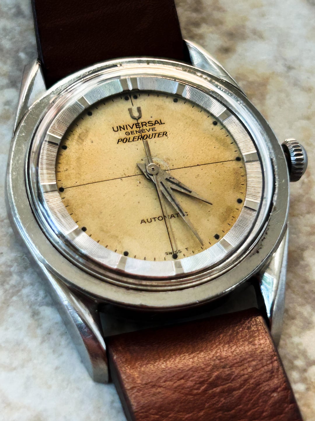 FOR SALE: Universal Geneve Polerouter 868108/2 (circa 1965) A super cool larger size Polerouter from the mid 1960s. Just serviced (2025). Only issue is it now has a generic crown. Original crown stripped in service. Including it in purchase in case you can find someone to repair it. Also, the dial has some wear. That's why I'm selling at a discount. Polerouters are rising in price 👹👹👹 Asking $2000 OBO Timestamp and Crown pic: https://imgur.com/a/1mvFwkk