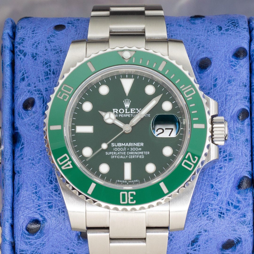 Up for sale is the Rolex Submariner Date 116610LV, nicknamed the “Hulk” for its striking green sunburst dial and matching green ceramic bezel. Originally introduced in 2010 and discontinued in 2020, the Hulk has become one of the most collectible modern Submariners. Timestamp: https://imgur.com/a/vOLuKIV Additional Photos: https://imgur.com/a/Y69yuIk This example is a G serial, placing it among the earlier production years of the reference. The watch is in excellent condition, showing only minimal signs of careful wear. The green dial remains vibrant, the ceramic bezel is flawless, and the Oyster bracelet retains sharp brushing and full integrity. Tested on the timegrapher, it runs strong with 300 amplitude at +2 seconds/day, well within Rolex performance standards. Details • Reference: 116610LV • Serial: G (2010 , early production) • Case: 40mm stainless steel Oyster • Dial: Green sunburst (“Hulk”) • Bezel: Green Cerachrom, unidirectional • Crystal: Sapphire w/ Cyclops • Movement: Rolex Caliber 3135, automatic • Accuracy: +2s/day, 300 amplitude • Bracelet: Oyster, stainless steel • Condition: Excellent • Set: Watch only ⸻ Price: $16,457 📍 Palazzo Di Luxury, Jersey City, NJ 📧 [email protected] 📲 (551) 345-4998 📸 Instagram: @palazzo.di.luxury 🌐 Website: www.palazzodiluxury.com ⭐ Google Business: https://share.google/uX1mjtiKersIUEGLO 🏦 In-person transactions available at our office (appointment only) 💳 Bank wire, Zelle 🔄 Trades considered