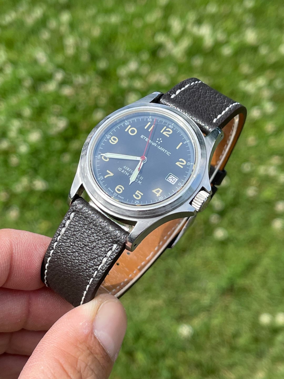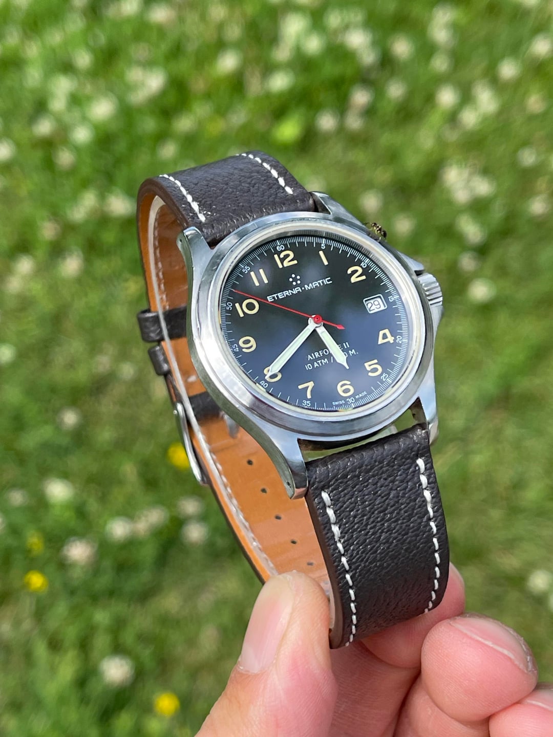 Hey all! Here is for sale a nice Eterna Airforce II Ref. 8407.41 in great condition. For sale is the watch only. Case measures 37.2 x 44.2mm, with a thickness of 9.7mm and a lug width of 20mm. Case case signs of wear, but major dings or scratches. Caseback has Eterna logo and serial number. Crystal is sapphire, has no blemishes. Crown is screw down, has Eterna logo and is protected by case’s crownguards. Best thing right here is the dial, it has a classic pilot watches design having black color and big lumed arabic hourmarkers, lumed hands, date at 3 o’clock. Dial has Eterna logo and Airforce II 10 ATM/100M inscriptions and Swiss Made at the bottom. Movement is reliable ETA 2824-2 automatic, at the moment of sale keeps time –11 sec/day, please check timegrapher pic in gallery. Strap is brand new 20mm genuine leather which looks great with the watch shape and great looking dial. Detailed pics/videos: https://imgur.com/a/GWb79EI Timestamp: https://imgur.com/a/GWb79EI#MENDxAO Price is $550 through PayPal Friends and Family. EMS International Shipping is included in price. I ship international. I’ve sold a couple watches here, so you can check my feedback on r/WatchExchangeFeedback I am not interested in trades. Please PM me if you have any questions