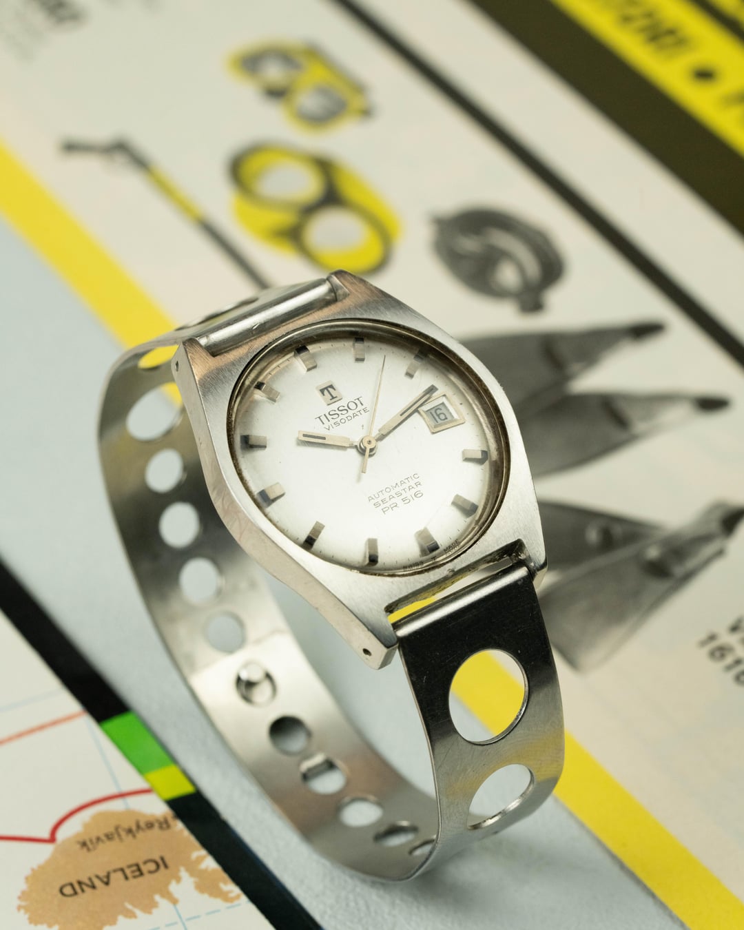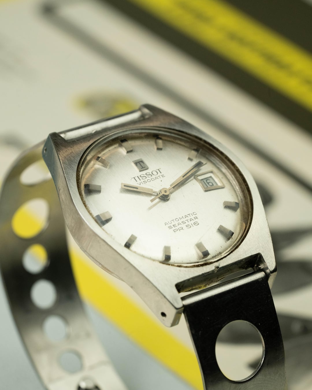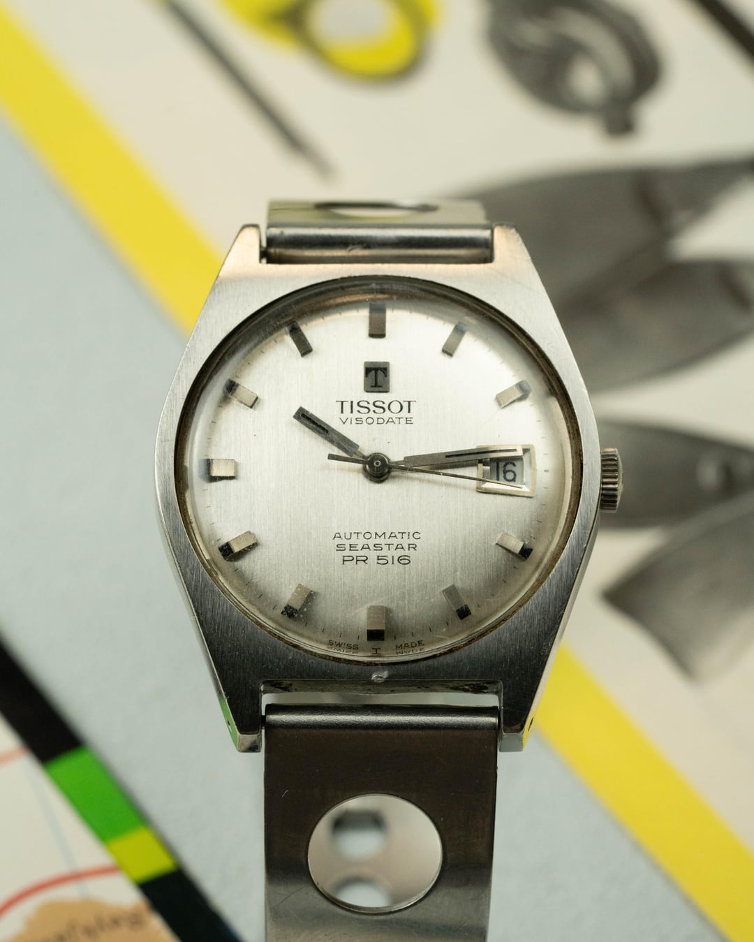 The Tissot Seastar PR 516 Visodate is a classic 1970s sports watch, produced during the brand’s close association with Omega and built to the same high standards of Swiss watchmaking. This example features a 36.5mm stainless steel case in excellent original condition, retaining its sharp edges and factory brushing. The silver brushed dial is well preserved, with applied steel markers, warm custard tritium lume plots, a trapezoid date window at 3 o’clock, and original paddle hands with perfect tritium lume. A clean acrylic crystal and screw-down case back complete the robust yet refined design. Powering the watch is the reliable Tissot caliber 784-2 automatic movement with 21 jewels, offering excellent accuracy and power reserve. This piece is fitted with its original perforated stainless steel “racing” bracelet, an iconic design element of the PR 516 line, which wears larger on the wrist thanks to its integrated style. With its combination of durability, motorsport-inspired flair, and vintage charm, this PR 516 is an outstanding choice for both collectors and everyday wear. **Key Features** • Brand: Tissot • Model: Seastar PR 516 Visodate • Case: Stainless steel, \~36mm • Dial: Silver sunburst with applied rectangular hour markers, good vintage condition • Crystal: Acrylic • Movement: Automatic • Bracelet: Original stainless steel perforated “racing” bracelet • Functions: Hours, minutes, seconds, date • Condition: Well-preserved vintage piece; dial shows light aging consistent with age, case retains sharp lines with minor wear, bracelet complete and functional, movement running properly Please reach out if you want to see this or any other watch over FaceTime. See all pictures for details and timestamp. Feel free to message, comment, or PM me any questions you may have. Shipping is included in the United States. I accept most forms of major payment. For more vintage watches and first dibs on affordable pieces follow my Instagram at: [Ar.ro.ws](http://ar.ro.ws/) If you would like a payment plan I do accept Klarna here [on my website](https://www.arrowsvintage.com/shop/p/tissot-seastar-pr-516-visodate)