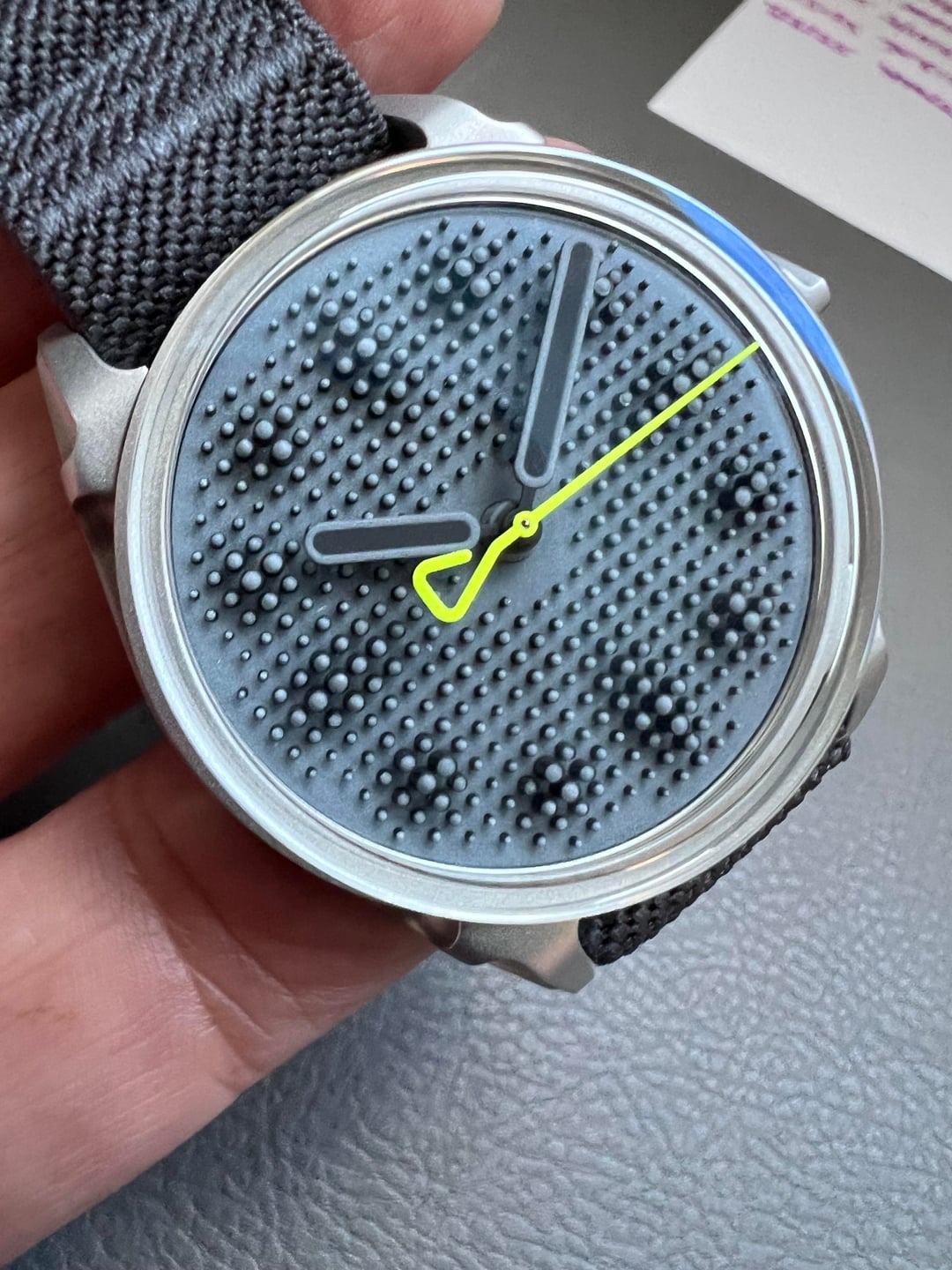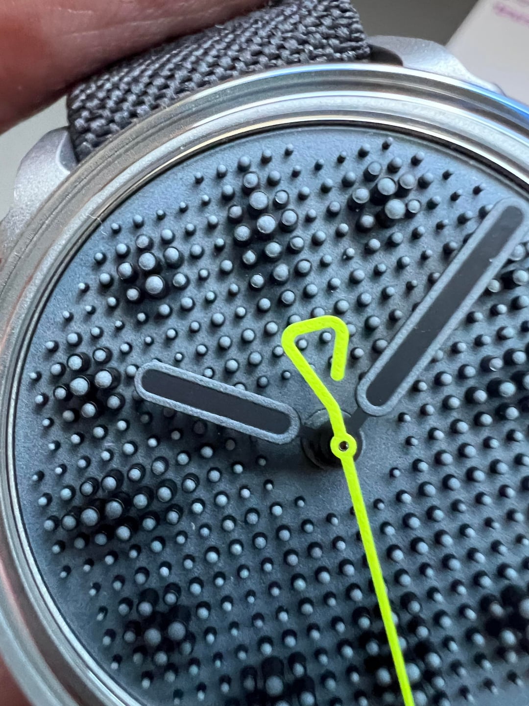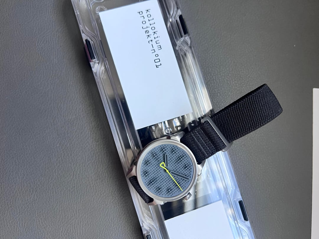 Up for grabs is my kollokium. It is a bold expression of neubrutalist design, merging industrial aesthetics with meticulous craftsmanship. Limited to 499 pieces across the E1 and E2 series, this timepiece stands out with its distinctive dial and robust construction and sold out quickly. I’m the original owner and bought it on an impulse during the release. At the heart of the E1 is a three-dimensional dial featuring 468 individually hand-applied cylindrical markers. These markers, crafted from black PVD-coated steel, vary in six different diameters and heights, creating a textured, pixelated landscape reminiscent of a pin art board. Each cylinder is filled with grey Super-LumiNova that emits a blue glow in low light, enhancing both aesthetics and legibility . The hour and minute hands are black with grey luminescent outlines, while a fluorescent yellow seconds hand adds a striking contrast. The boxed sapphire crystal adds a further dimension to enjoy viewing the dial from a side profile. **Condition:** Brand new. Tried on and wore for 30ish seconds. **Scope of delivery:** Full set. **Specs:** Case size: 40mm Lug-to-lug: 48mm Case thickness: 11mm w/ the crystal Water resistance: 50m **Price:** $3500 shipped to your local FedEx Office hold location **Methods of payment:** Zelle or wire only **Trades:** Open to sports watches and divers with cash my way or yours. **References:** Hundreds of successful transactions in watch trading. See my eBay account under the same name. Many references in Facebook groups, watch forums, and on WUS.