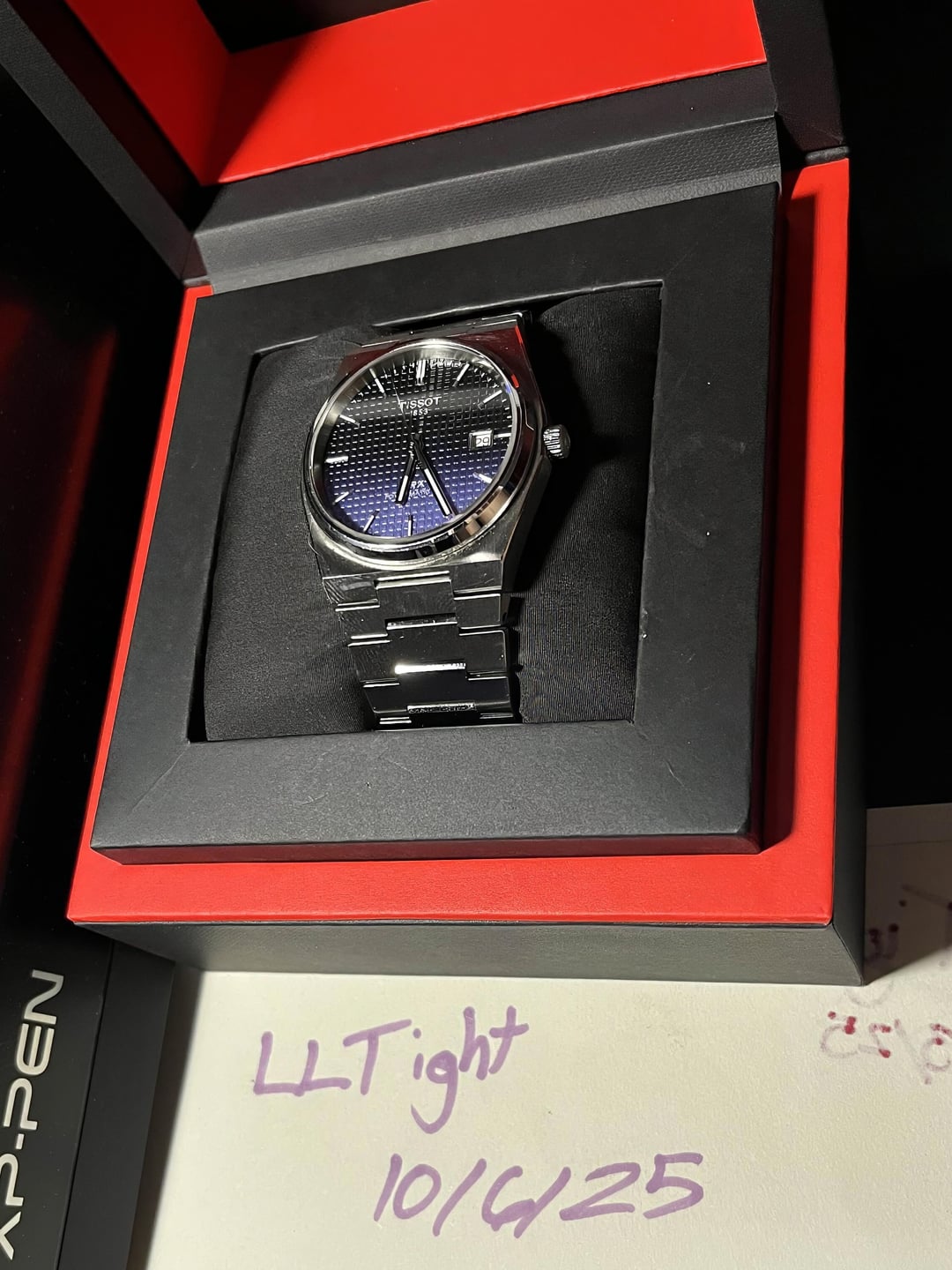 Up for sale is my **Tissot PRX Powermatic 80 (40mm)** featuring the popular gradient dial. This model blends Tissot’s retro design with modern specs, and the dial shifts beautifully in different lighting. **Specs:** * Diameter: 40mm * Movement: Swiss automatic Powermatic 80 (80h power reserve) * Case: 316L stainless steel * Caseback: See-through exhibition * Crystal: Scratch-resistant sapphire with AR coating * Bracelet: Integrated stainless steel w/ quick release, full links included **Condition:** Excellent pre-owned with light wear, sapphire is clean. **Set:** Full set – box, warranty card, bracelet w/ all links. **Price:** $600 (negotiable) – PayPal F&F preferred, G&S if buyer covers fees **Shipping:** CONUS included, international available at buyer’s expense Timestamp + album: [https://imgur.com/a/9lZ3ayR](https://imgur.com/a/9lZ3ayR)