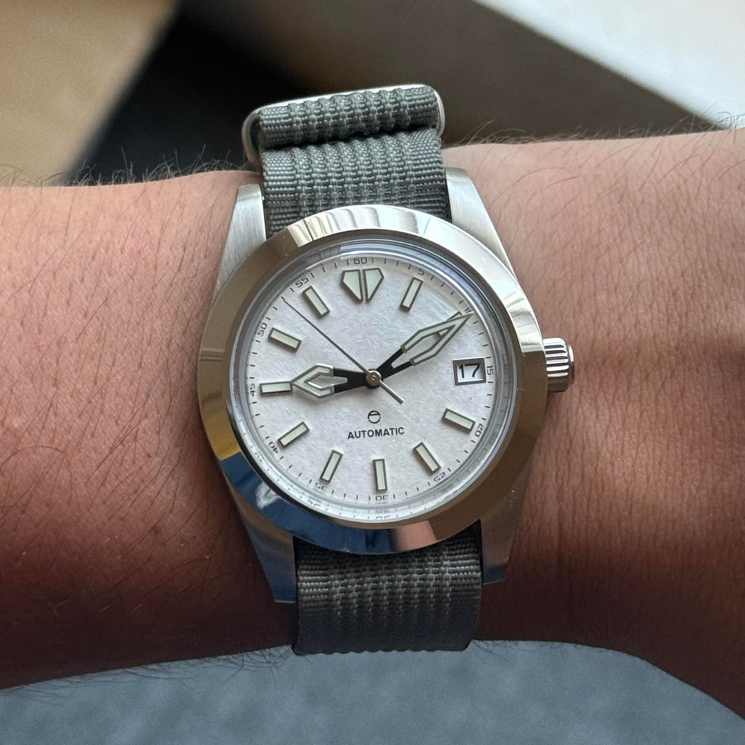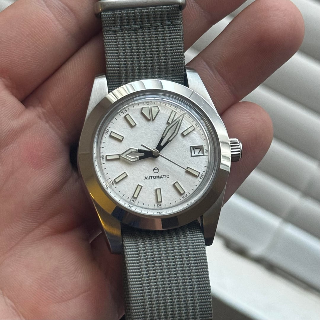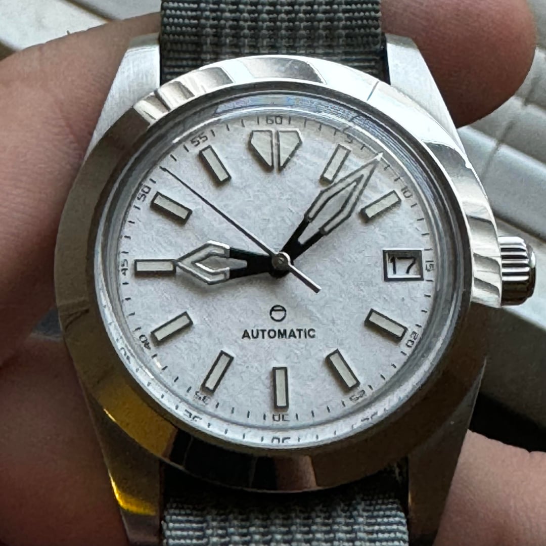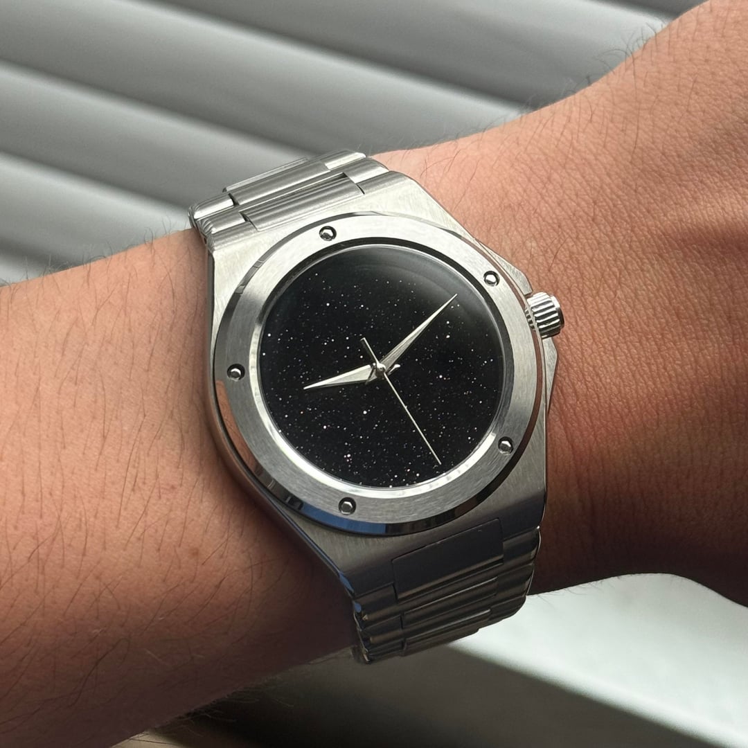 Paypal friends and family - no trades Interstellar Build - $225 Adventurine dial with brushed dauphine hands definitely steals the show here. Love this build but eyeing something else. 40mm case with integrated bracelet, 12.5mm thick, NH38 (no ghost date) Extra links, currently sized for a 6.5” wrist Arctic Build - $125 Snowflake textured dial with dagger hands. Great proportions at 38mm wide and only 11mm thick. Deserves a better strap but comes on a nato. NH35. Vintage Bakelite Sub - $115 40mm Watchdives vintage sub with a bakelite bezel made by odokadolo on instagram. real bakelite with faint but lumed numerals. Comes on a canvas strap.